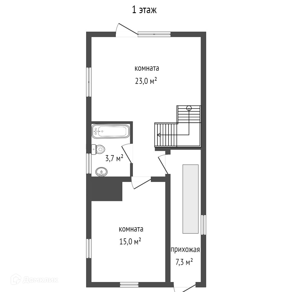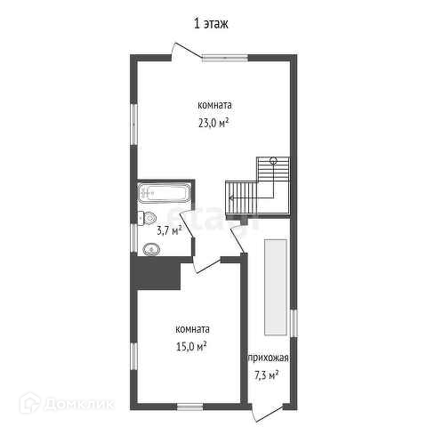 Первый этаж 49 кв.м., две комнаты, совмещённый сан.узел,прихожая.