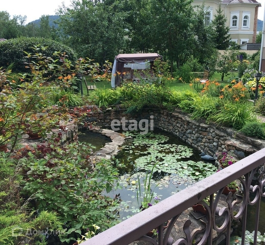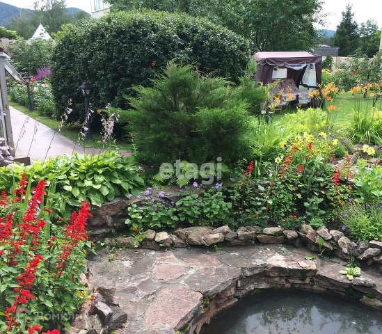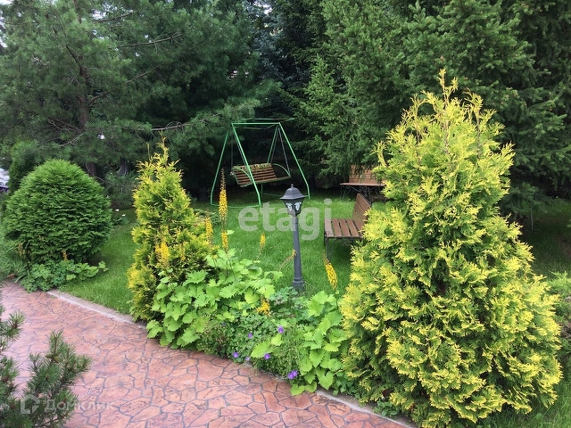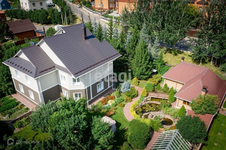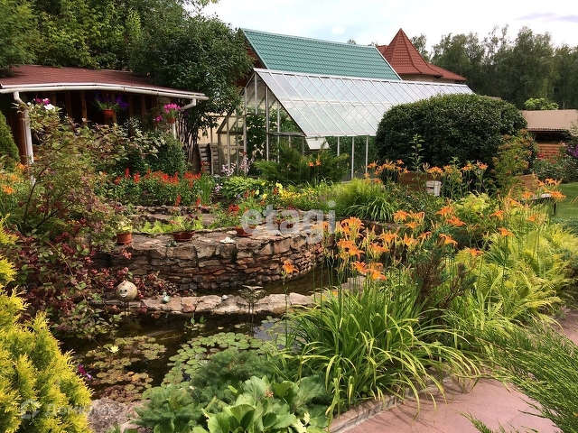 На территории имеется гостевой дом - баня из кругляка, зоной барбекю и спальней; пруд с водяными растениями и фонтаном, беседка и теплица из стекла. На участке Хвойные деревья - кедр, сосна, пихта, ель, можжевельник, туя.