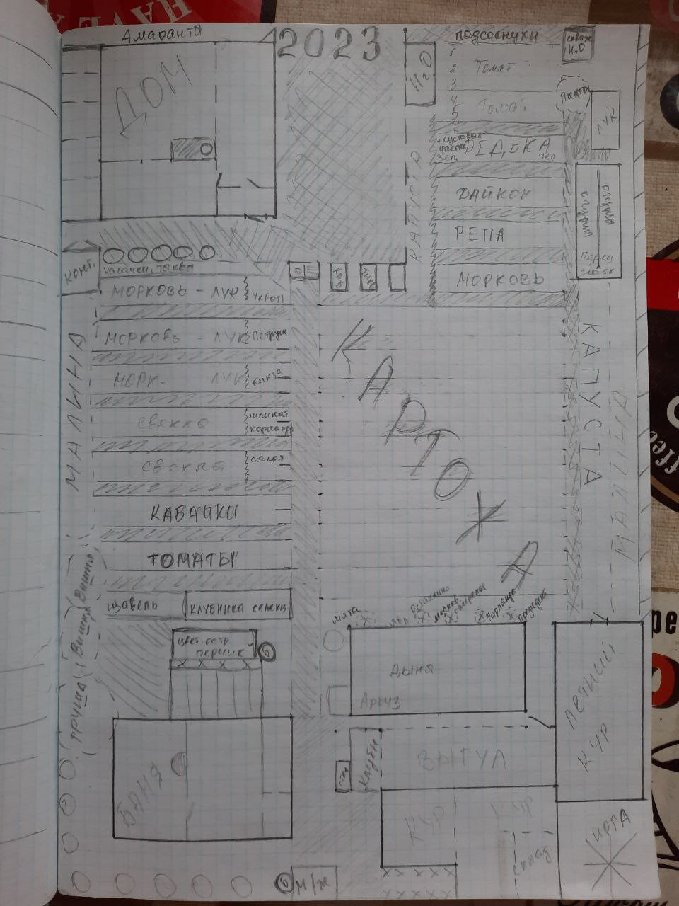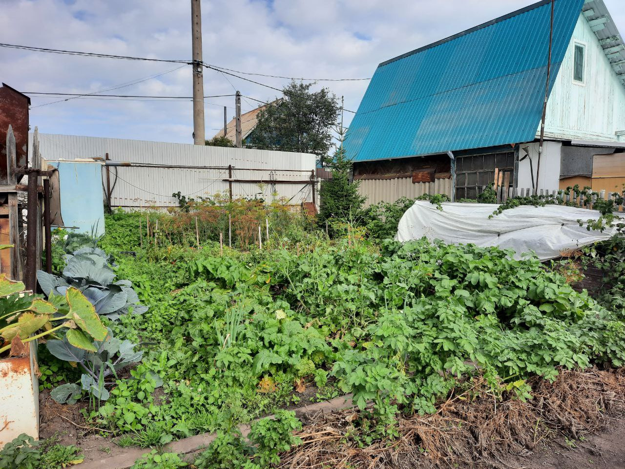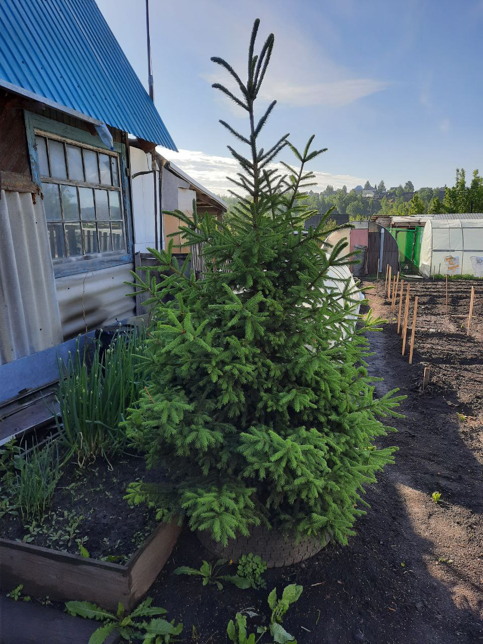 Насаждения: груша (плодоносит около 10 лет), малина, смородина черная, крыжовник, жимолость, вишня на ножке. Клубника, многолетний лук-батун. Декоративный Пузыреплодник и ель.