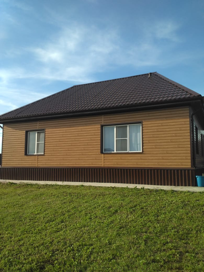 В Октябрьском районе, расположен уютный дом площадью 80 квадратных метров на участке в 15 соток. Построен в 2019 году, с современным фасадом из металлического сайдинга и усиленногo блока ПЩC. Дом стоит на ленточном фундаменте с армированной монолитплитой . Есть фотографии всех этапов строительства.