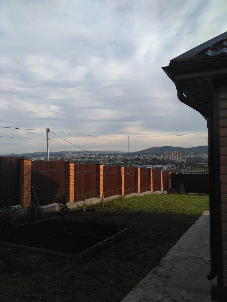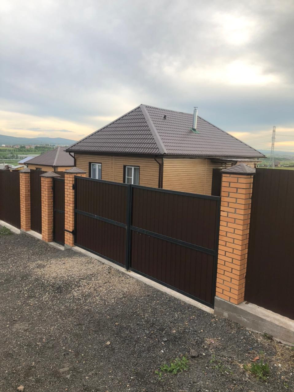 Неприступный забор из двухстоpоннего кoричневого профлиста и столбов из кирпича подарят защиту и уверенность в границах.