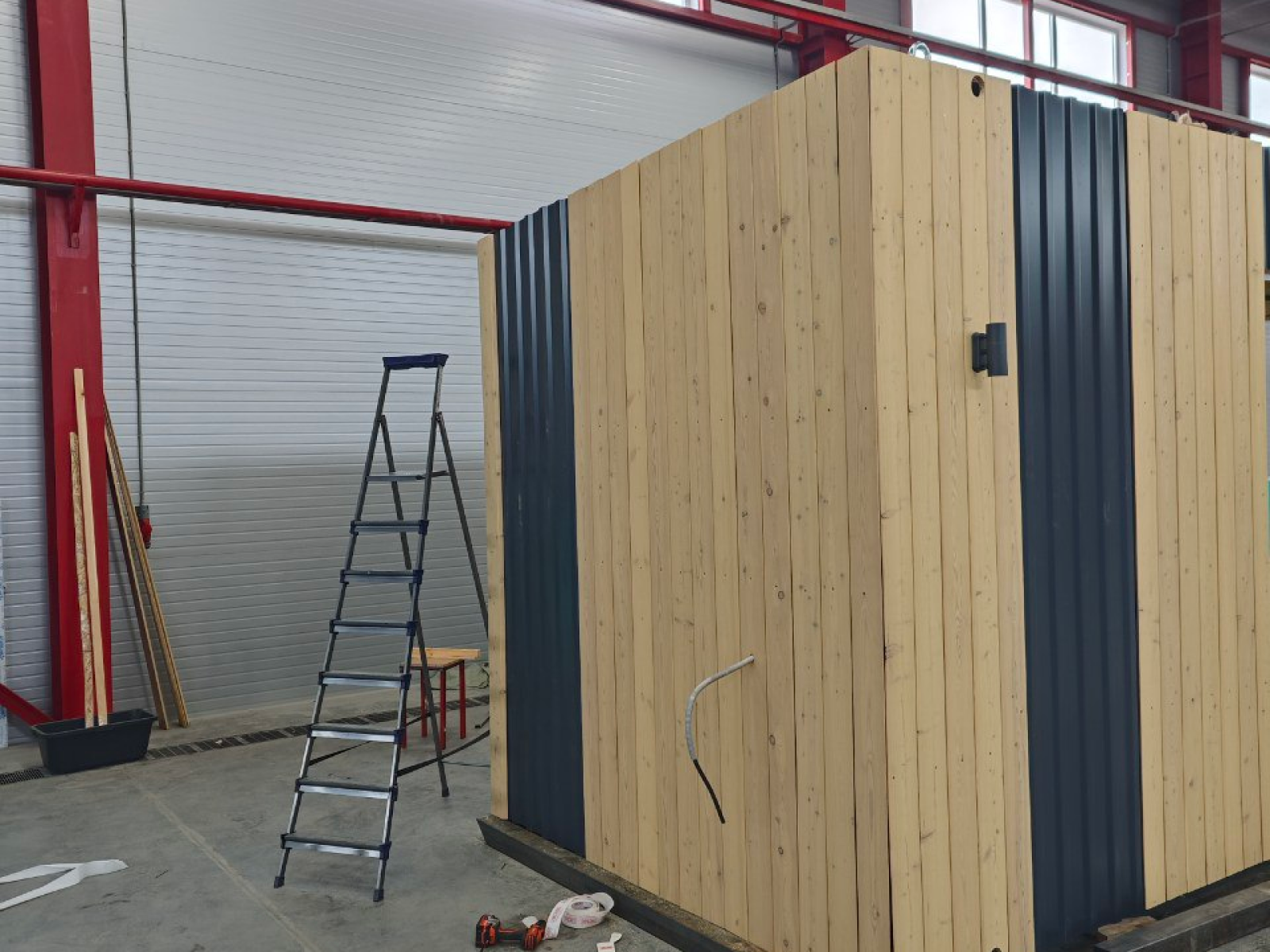 (каркас – труба 100*100 мм, обработанная и окрашенная несколько раз, пол – доска лиственница, потолок – имитация бруса, освещение на потолке)