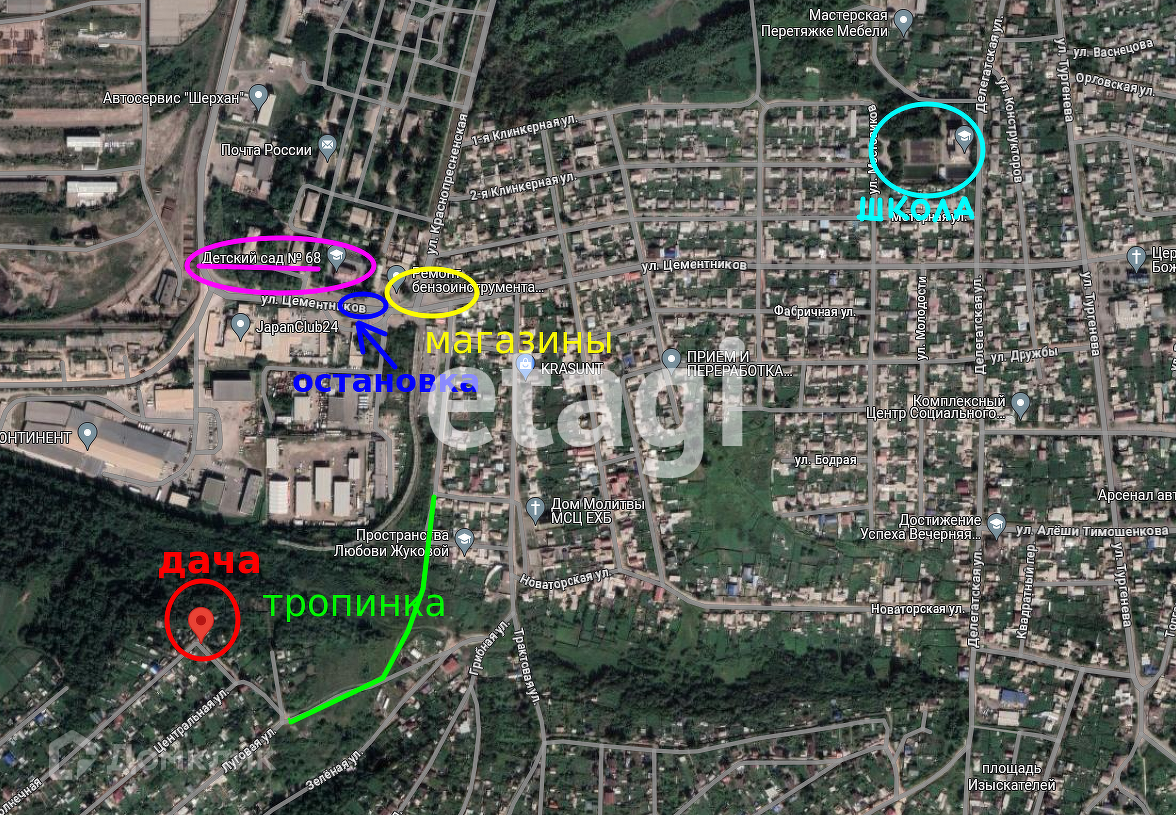 СНТ очень обжитое, многие живут круглогодично. По тропинке до остановки автобуса и магазинов 700 метров, до детсада - 800, до школы чуть дальше.