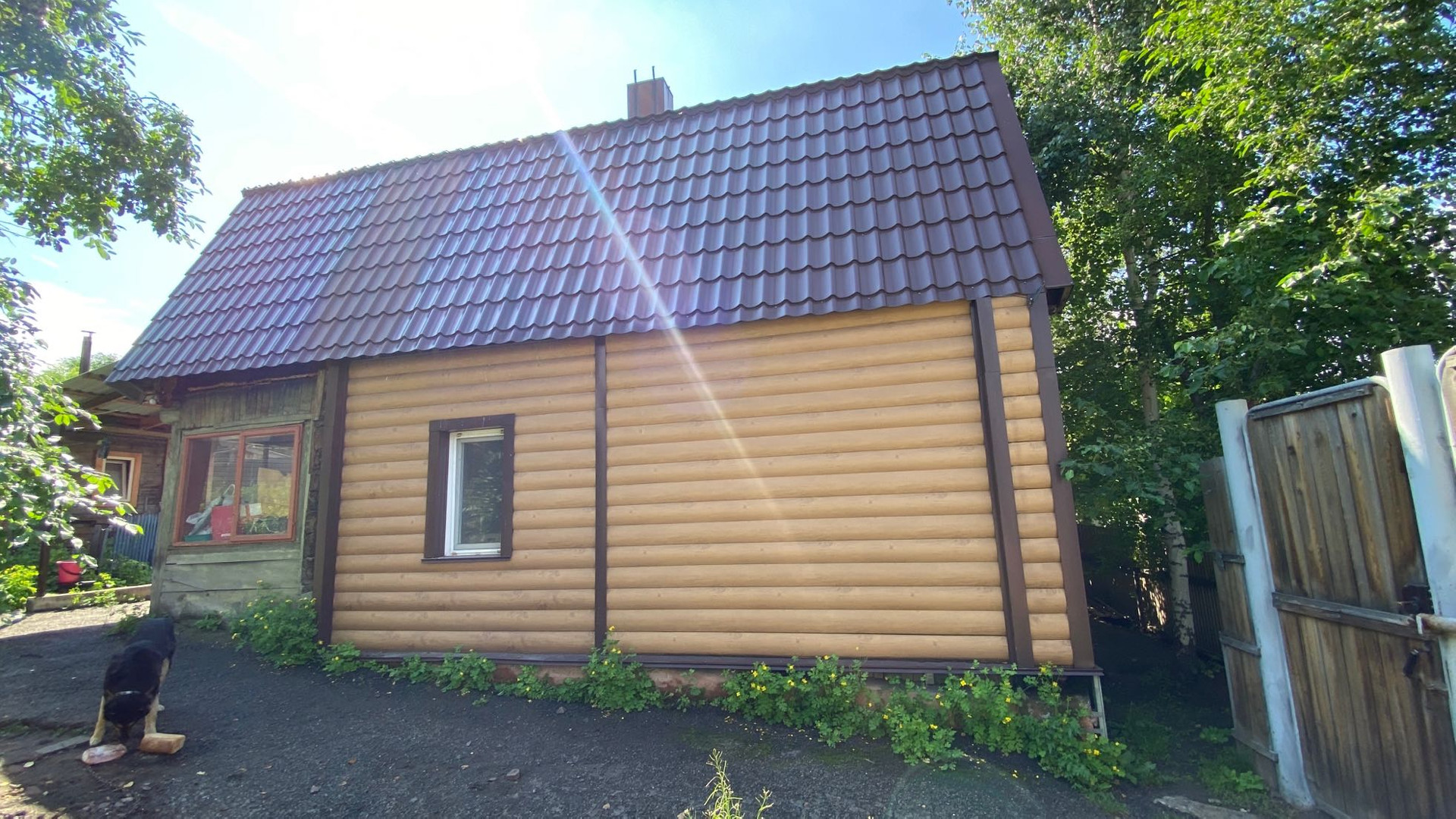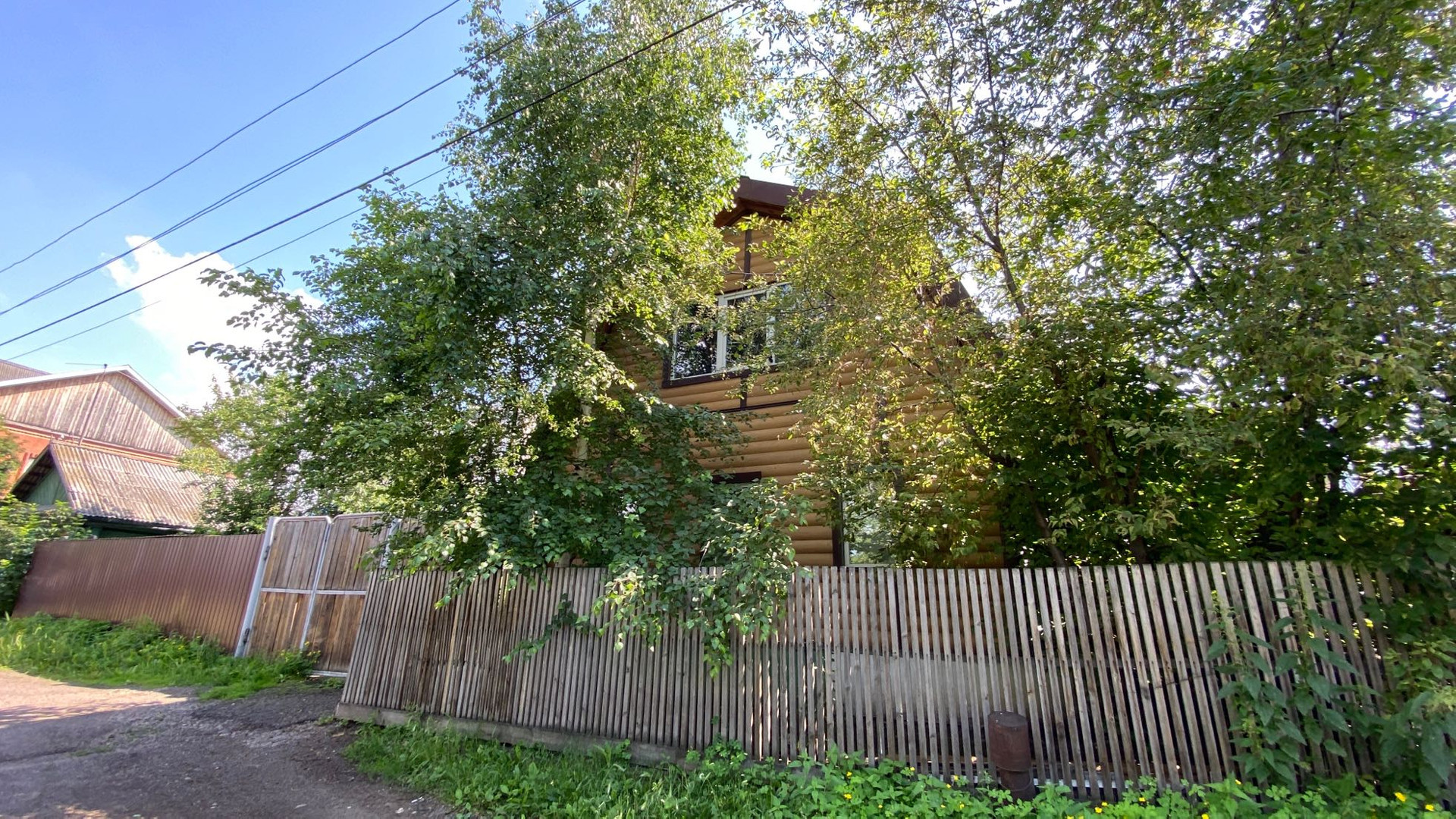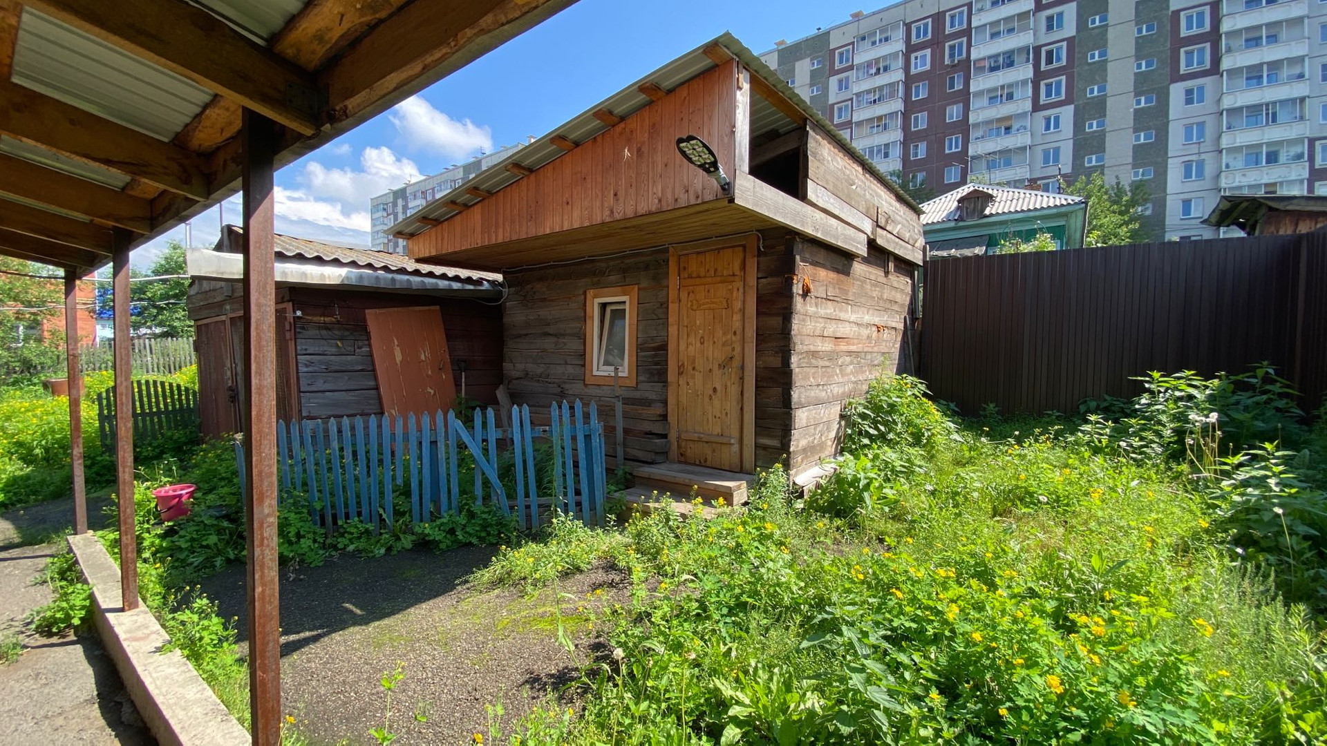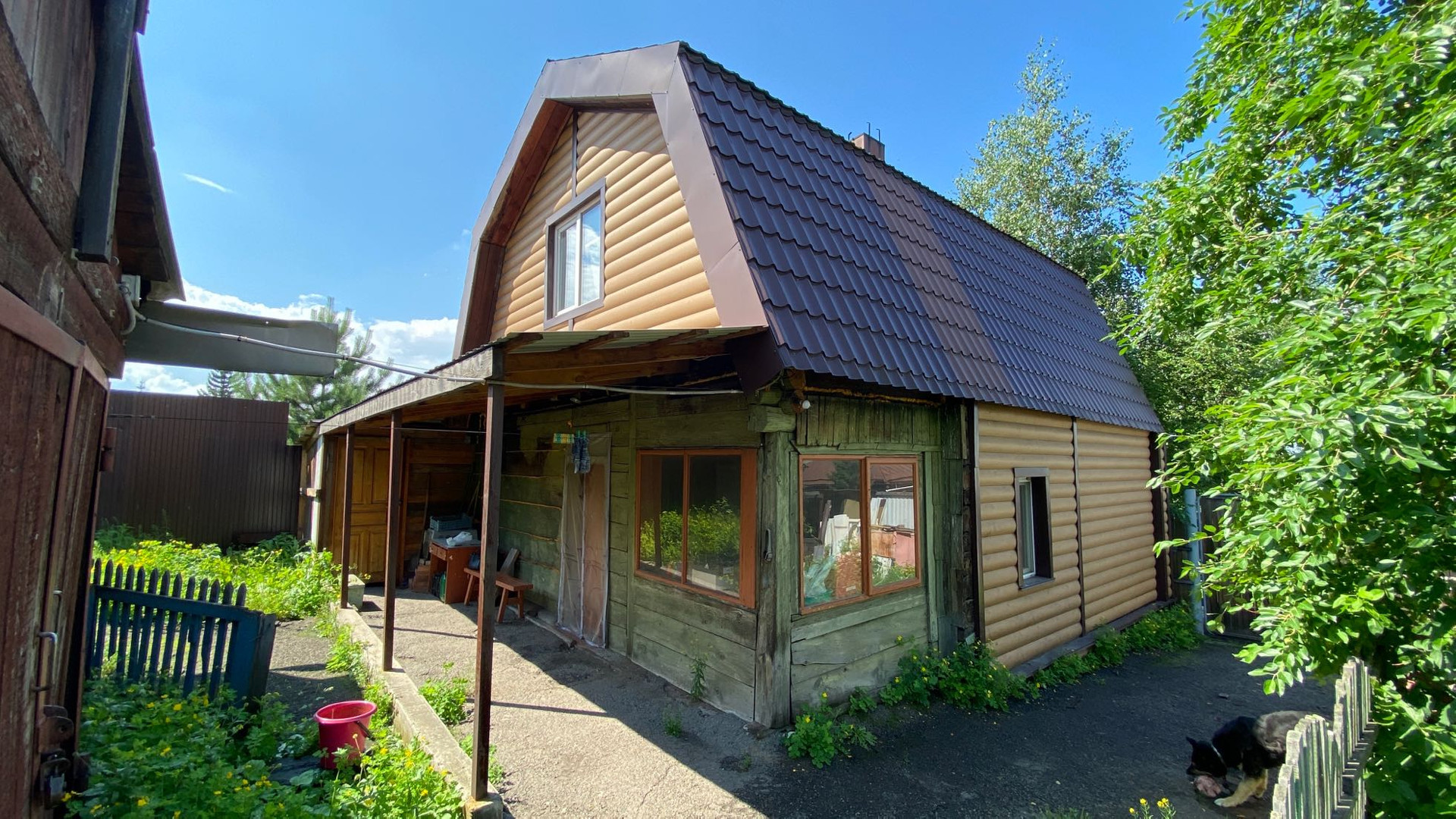 На собственной территории растут яблони, ирга, черемуха, малина. При желании можно вести огород или оставить газон.