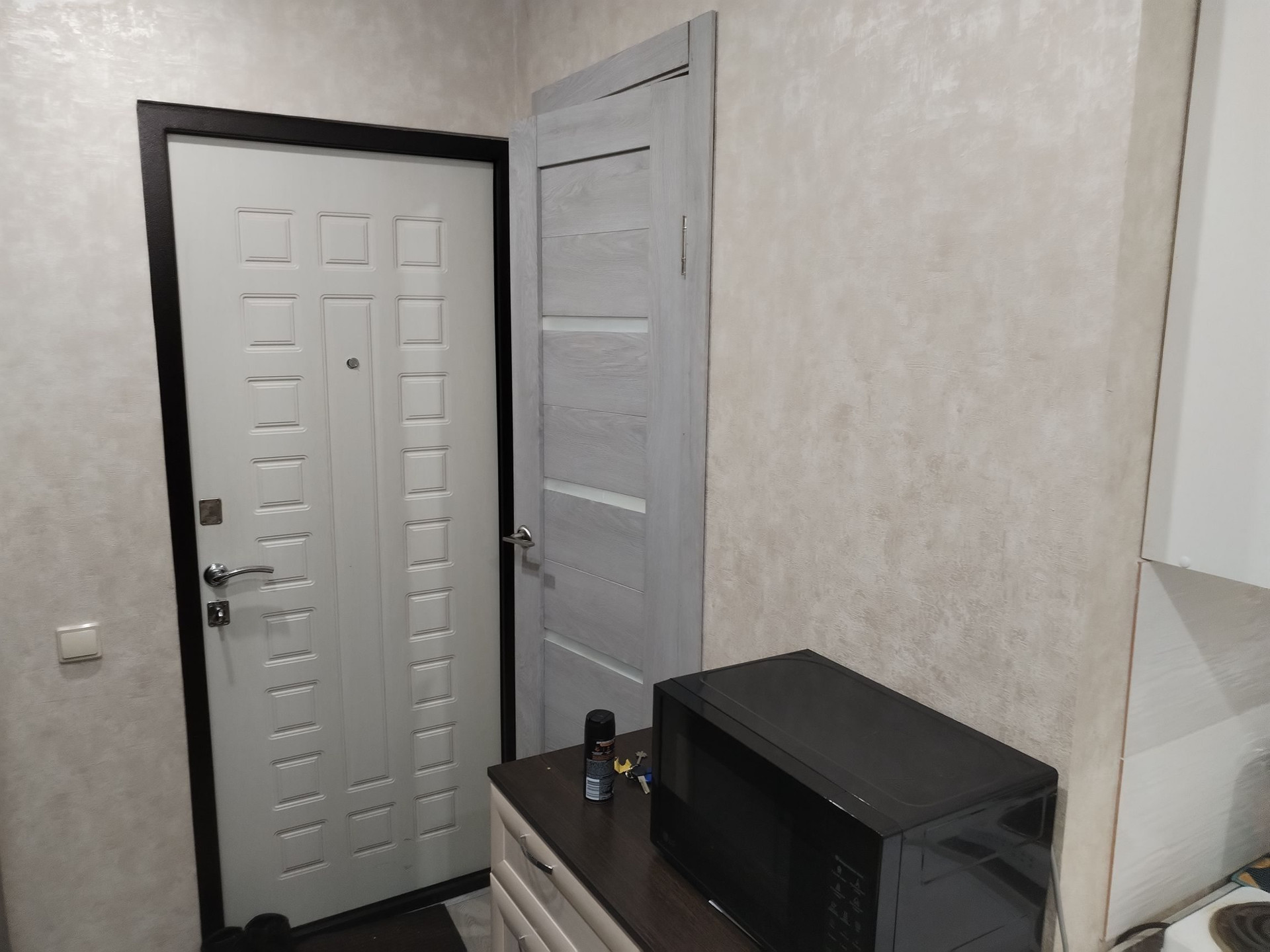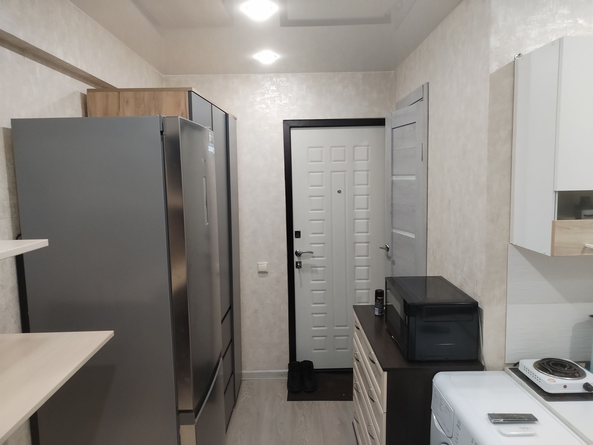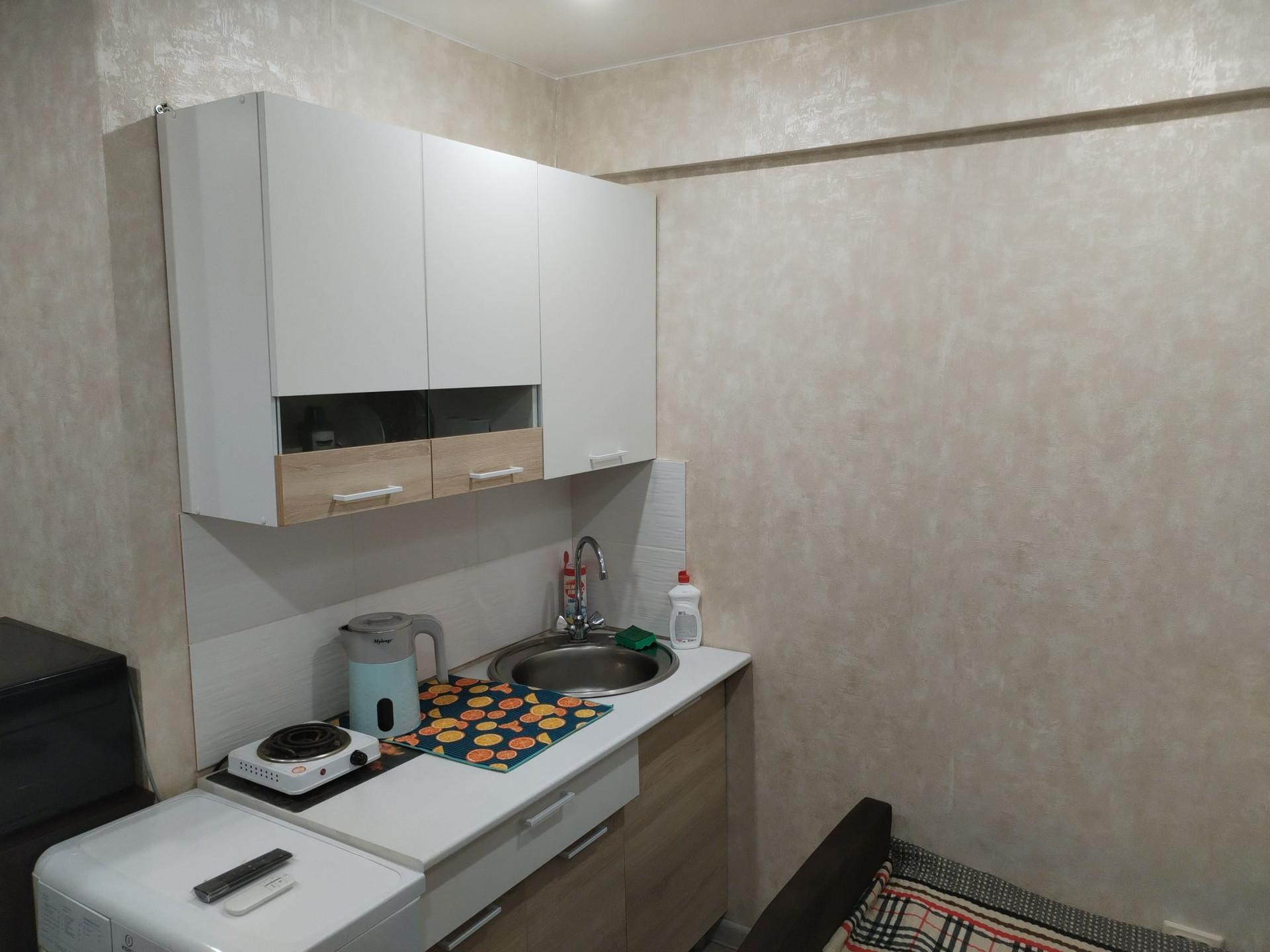 Продаётся отличная студия. Двери все на чипах, соседи все спокойные. Совмещенный санузел, весь в кафеле. На полу ламинат, натяжные потолки. Освещение включается с пульта. Большой балкон застекленный. Мебель:кухонный гарнитур, горка, комод, плательный шкаф, мини-диван-все новое, чеки имеются. Бытовая:телевизор, машинка-автомат, холодильник, чайник, плита-все новое, чеки имеются. Все остаётся. Дверь хорошая новая. Вода и канализация отдельный стояк, не насос. Заходи и живи. Собственник!!!