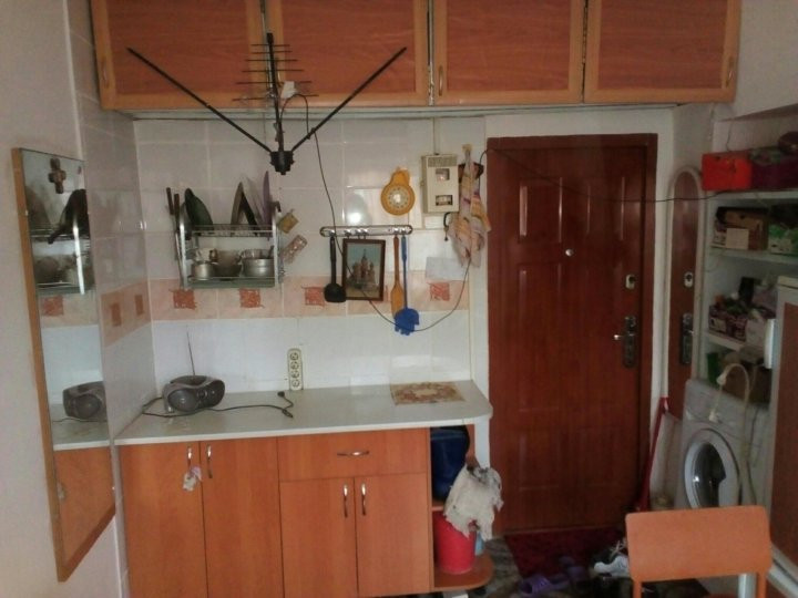На полу уложена плитка, стены окрашены в белый цвет, железная дверь, пластиковое окно, шкафы из профиля. Рядом социальный техникум, Командор