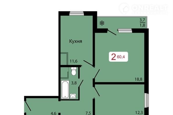 Общая площадь 60.7 м2