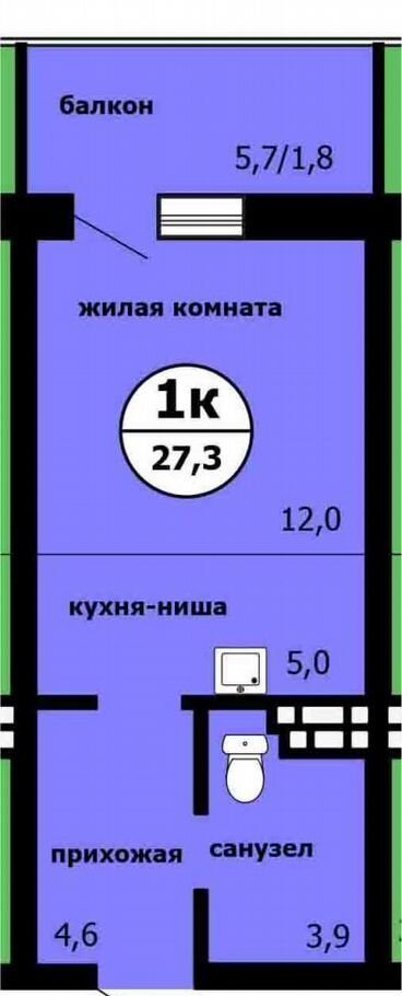 Квартира студия, 27.3 м2, этаж 7 / 9, на продажу в Красноярске