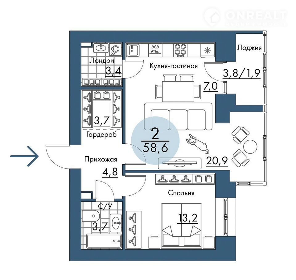 Общая площадь 58.6 м2