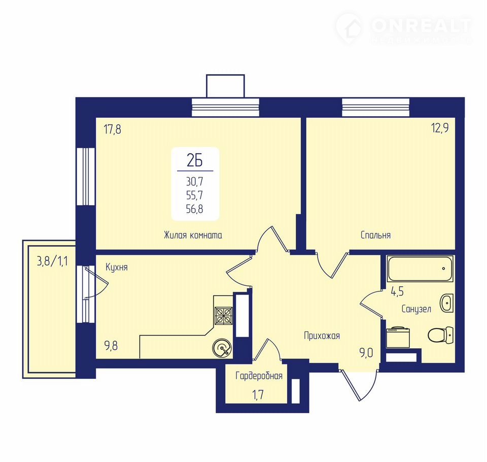 Общая площадь 56.8 м2