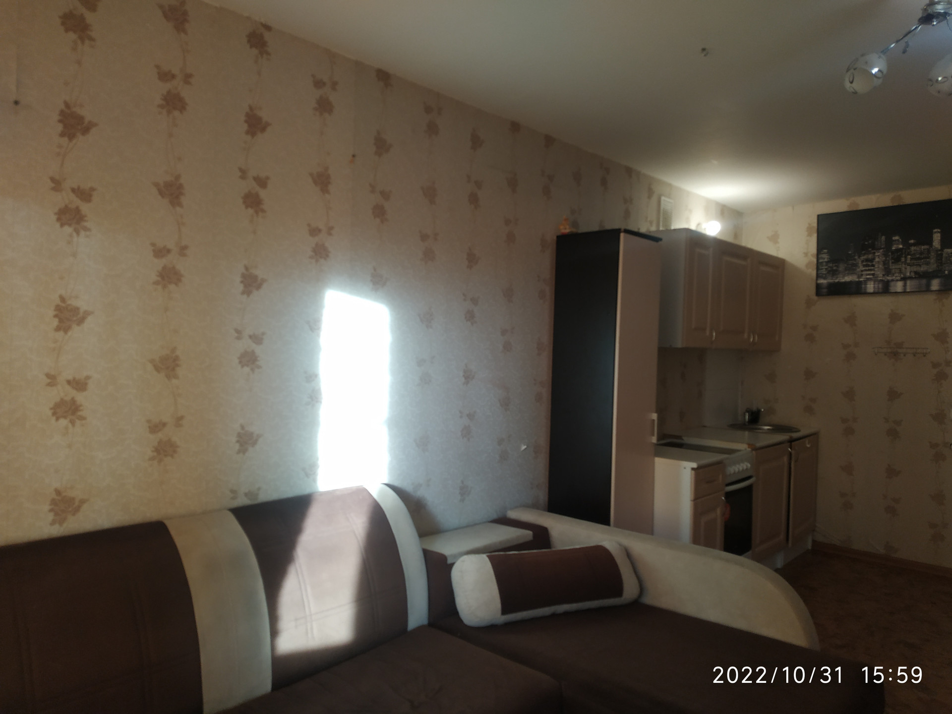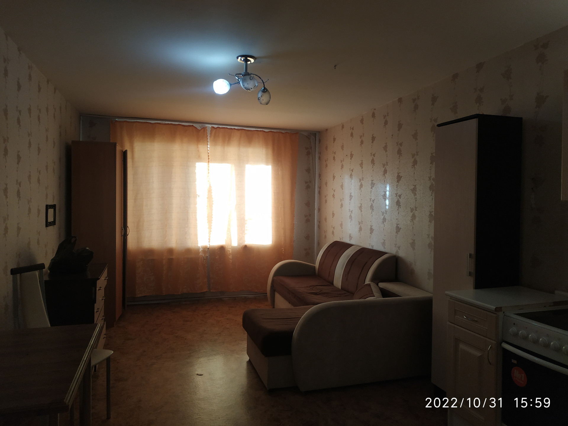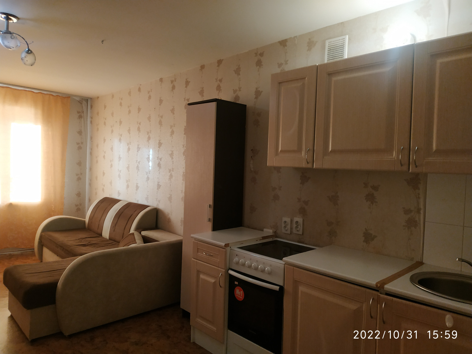 Состояние квартиры аккуратное: ровные оштукатуренные потолки, свежие обои, окно ПВХ, батареи радиаторы. Санузел совмещенный в кафеле. Остается все, что видите на фото: кухонный гарнитур с плитой, холодильник, стиральная машина, диван.