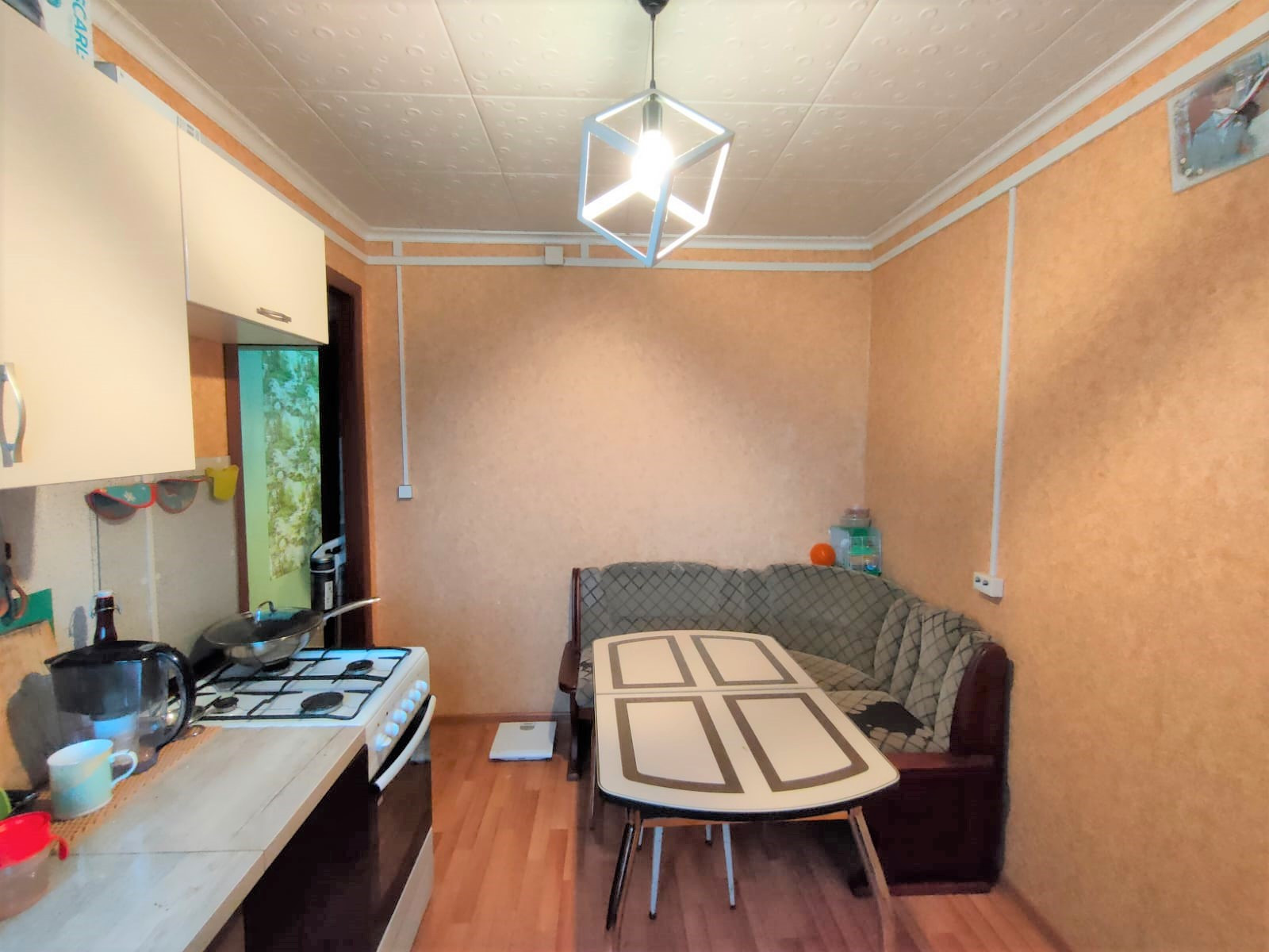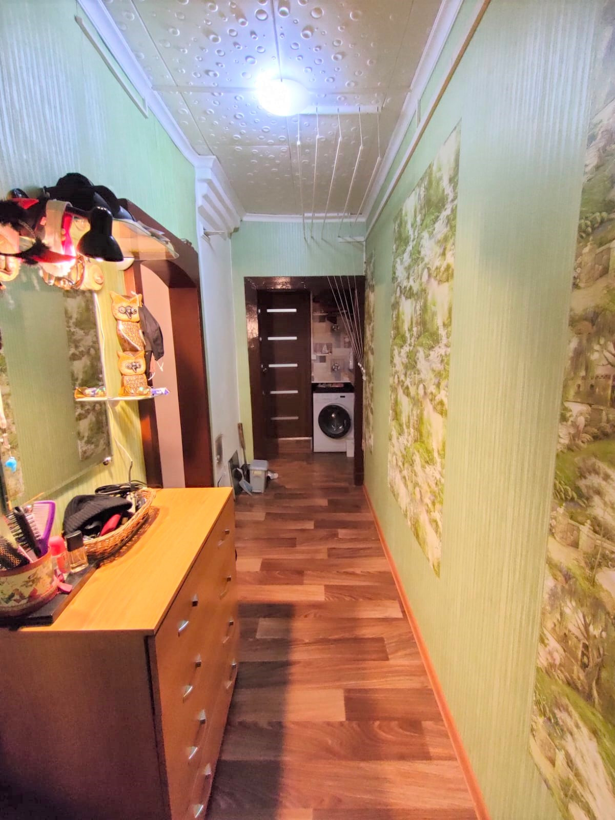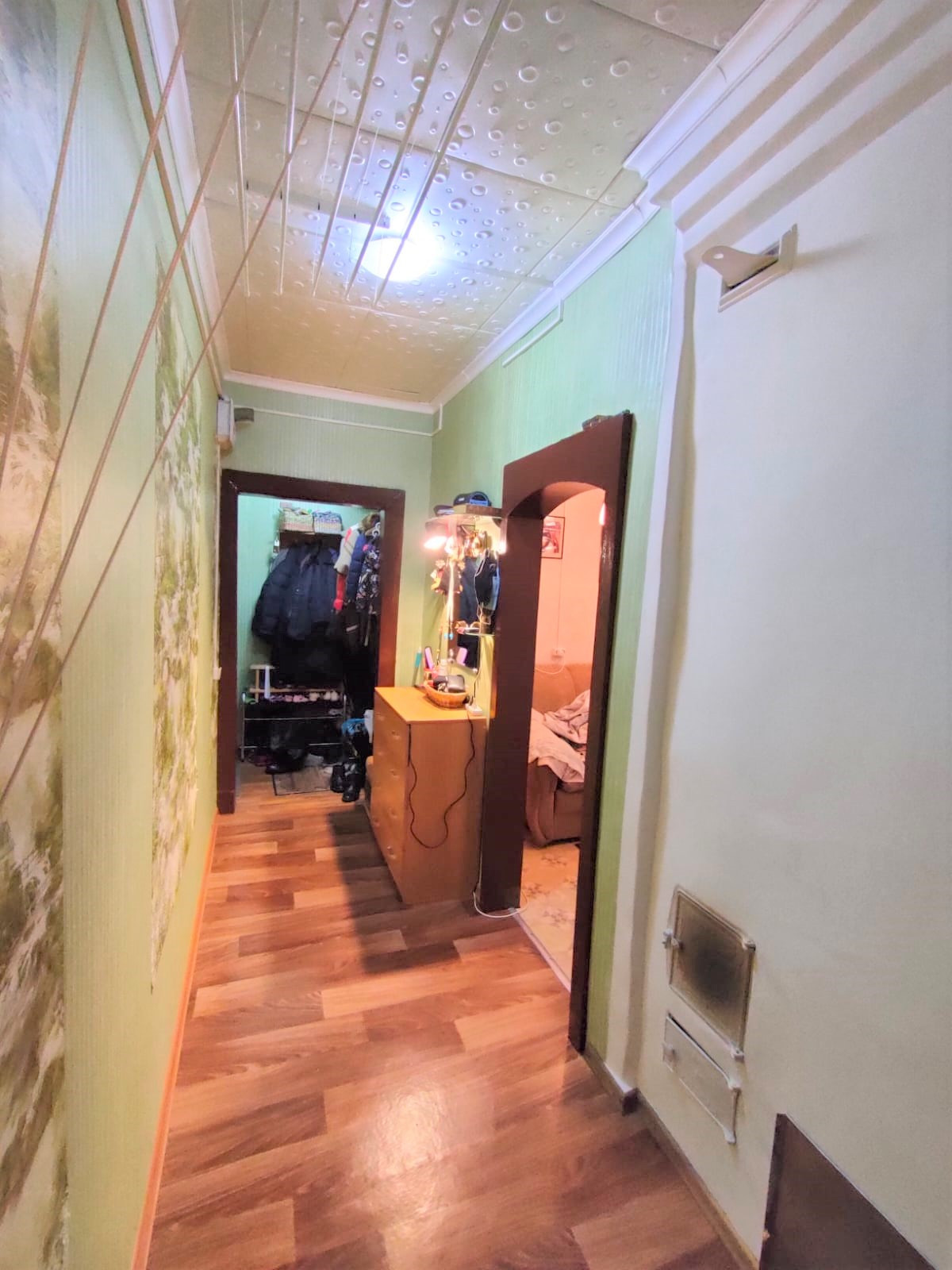 Общая S - 50,4 кв.м, жилая - 32,5 кв.м (20+12,5 - гостиная проходная), кухня - 8,5 кв.м, высота - 2,7 кв.м, санузел совмещенный (отделка стеновыми панелями), балкона нет, окна ПВХ, отопление электро + печное (на случай сильных холодов), центральное холодное водоснабжение и канализация, газ, ровные стены, чистые обои, на полу линолеум по всей квартире, отделка потолка моющейся потолочной плиткой,  проводка  по всей квартире поменяна на медную, новый электросчётчик, современная качественная входная металлическая дверь. Квартира чистая, живут приличные семейные люди с детьми. Соседи дружные, тихие.