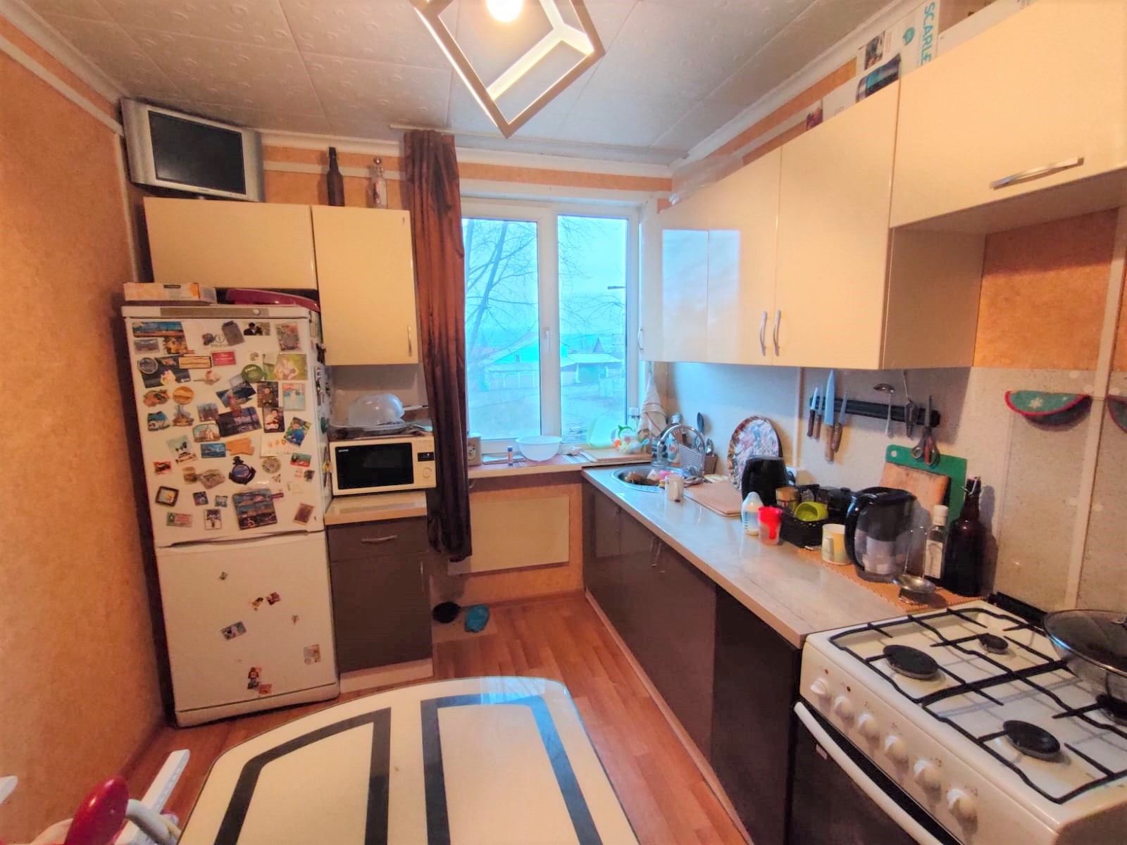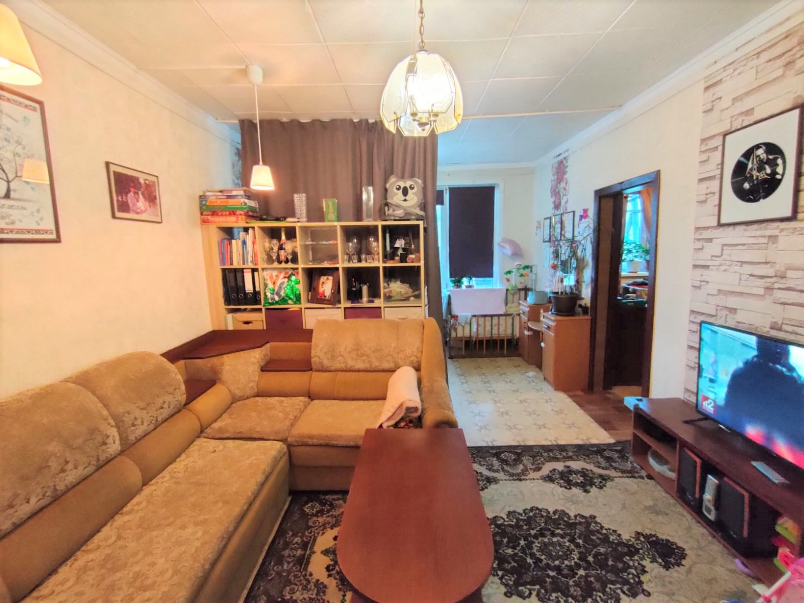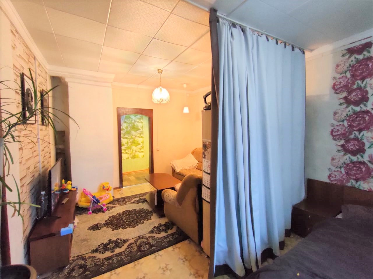 Общая S - 50,4 кв.м, жилая - 32,5 кв.м (20+12,5 - гостиная проходная), кухня - 8,5 кв.м, высота - 2,7 кв.м, санузел совмещенный (отделка стеновыми панелями), балкона нет, окна ПВХ, отопление электро + печное (на случай сильных холодов), центральное холодное водоснабжение и канализация, газ, ровные стены, чистые обои, на полу линолеум по всей квартире, отделка потолка моющейся потолочной плиткой,  проводка  по всей квартире поменяна на медную, новый электросчётчик, современная качественная входная металлическая дверь. Квартира чистая, живут приличные семейные люди с детьми. Соседи дружные, тихие.