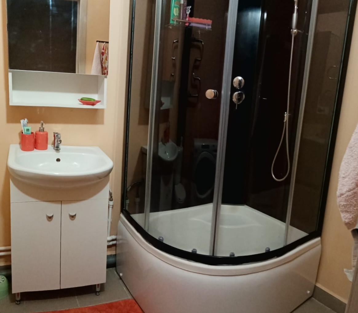 В ванной комнате установлена раковина с тумбой, душевая кабина с глубоким поддоном. Свободно можно разместить стиральную машину и сушилку для белья.
