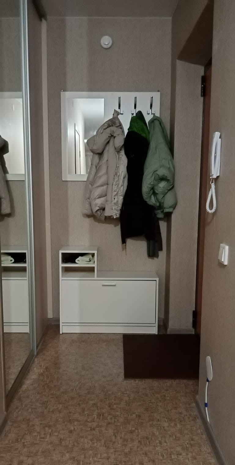 В прихожей на заказ установлен гардеробный шкаф, в который можно войти. Одна дверь из зеркала в полный рост. Женщины и девушки непременно оценят.
