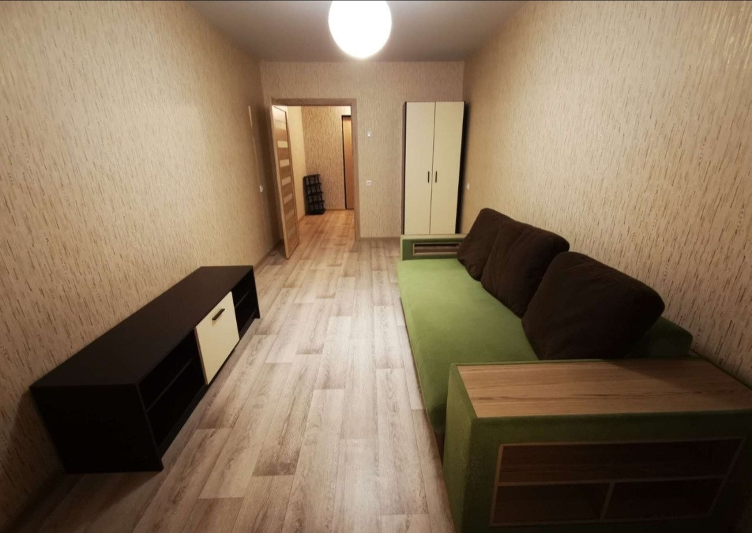 В квартире есть все необходимое для проживания: большой диван, небольшая горка в комнате и шкаф; в коридоре вешалка и комод; стиральная машинка, кухонный гарнитур, холодильник, эл.плита, обеденная группа. Мебель и техника остаётся по договорённости.