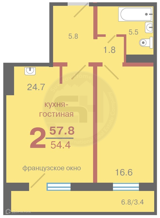 Общая площадь 57.8 м2