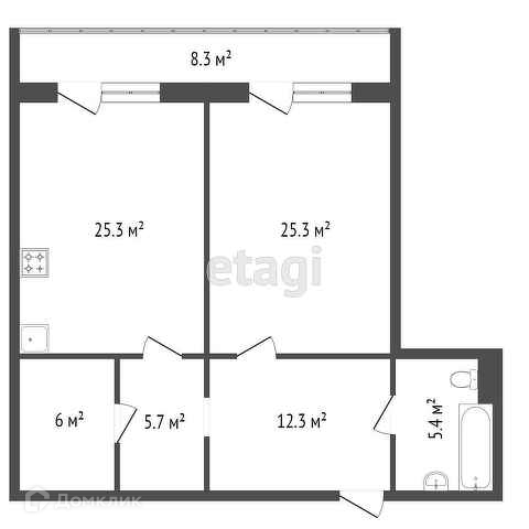 Общая площадь 79.9 м2. Две большие комнаты по 25 м2, в которых уютно и комфортно.