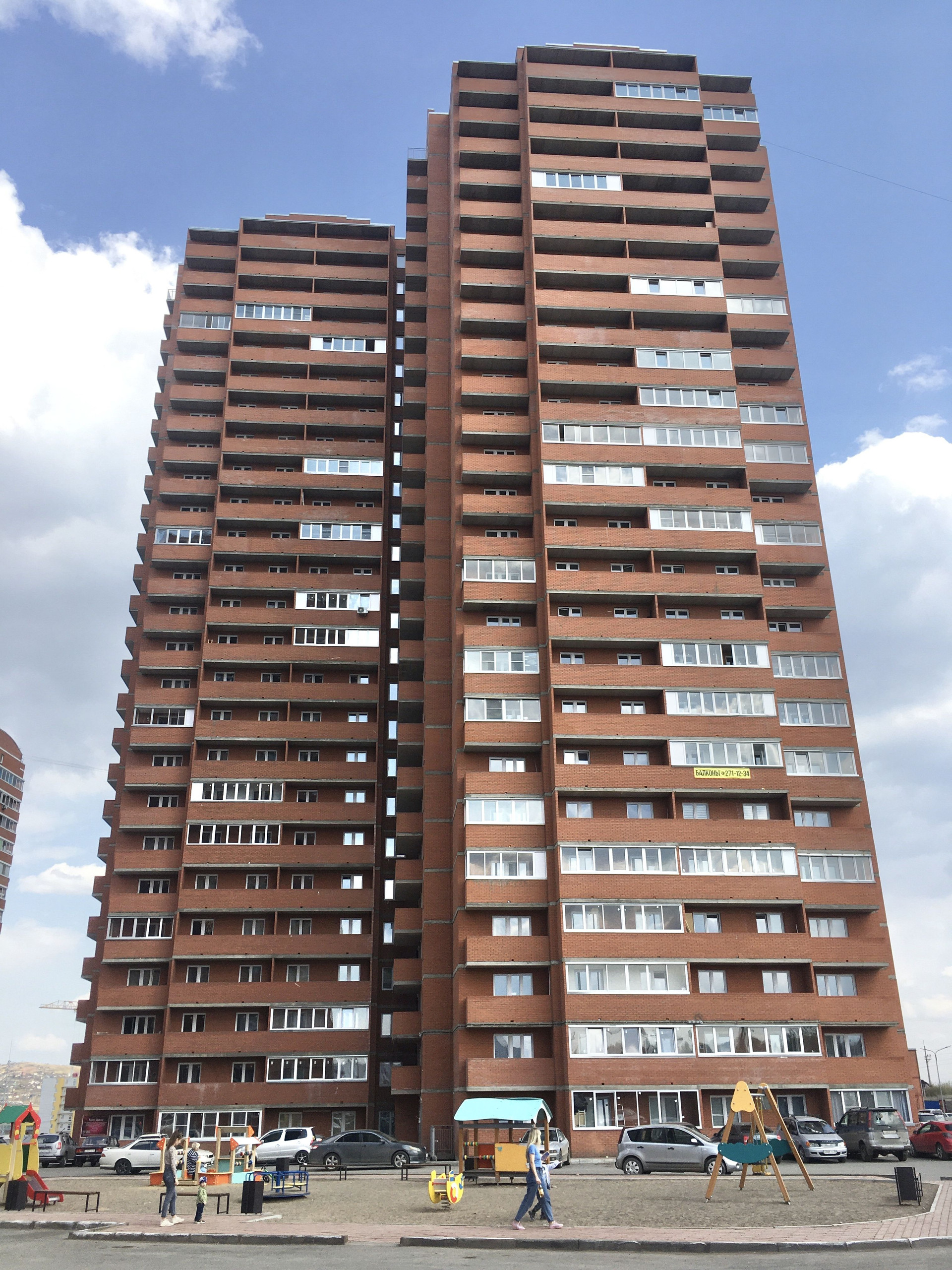 Прямо во дворе дома находится детская площадка, а широкие проулки оставляют достаточно места для парковки.