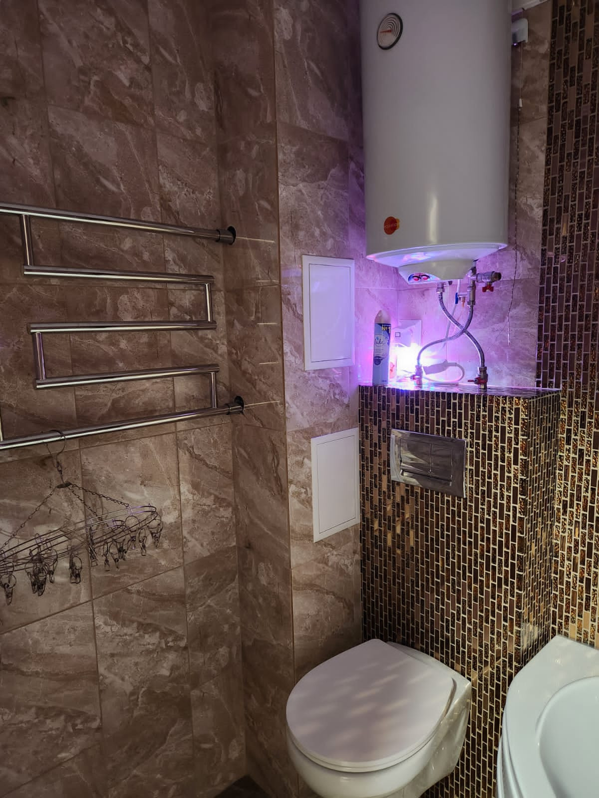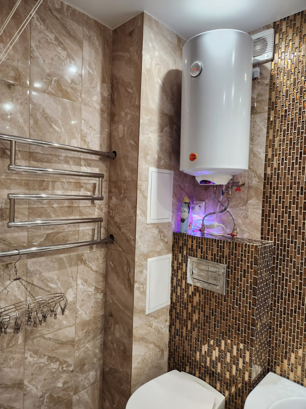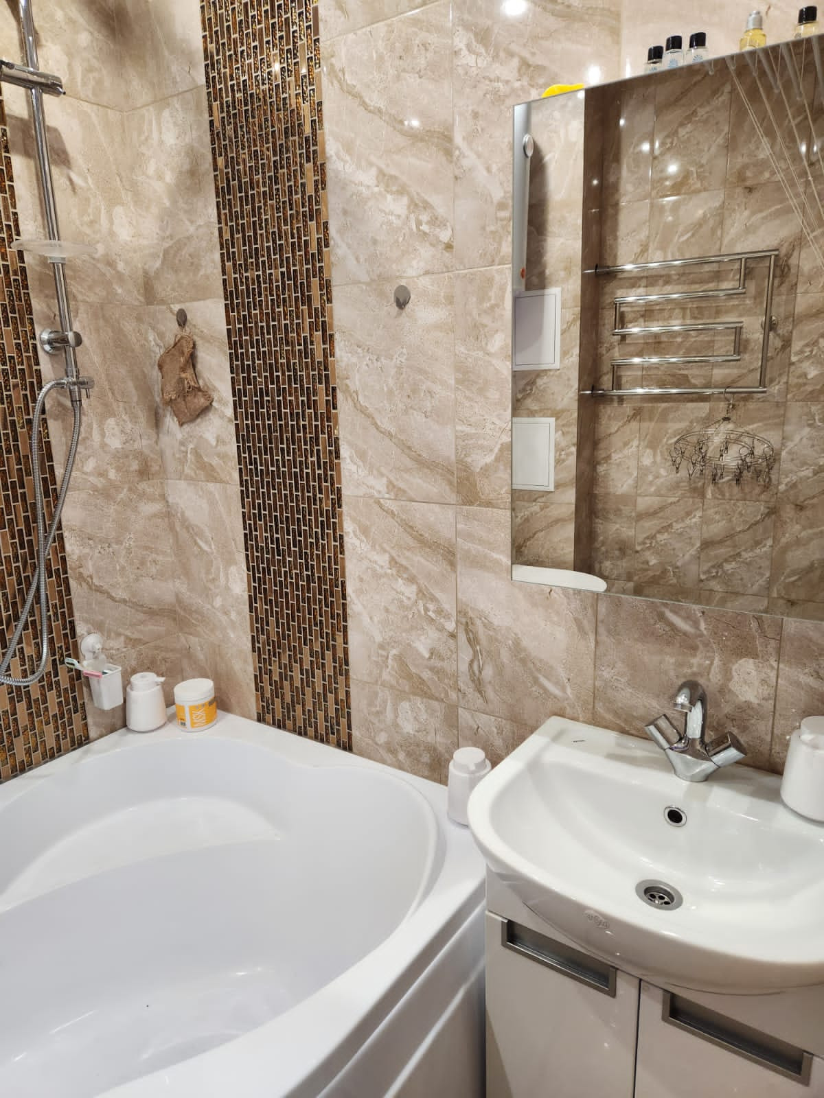 Имеется гардероб,окна пвх, санузел весь в кафеле с мозаикой, инсталяция, джакузи. Балкон из панорамных стеклопакетов, отделка панелями под кирпич, на полу керамогранит. Балконные окна открываются и сверху и снизу, что очень удобно для мытья стекол. На всех окнах установлена маскитная сетка.