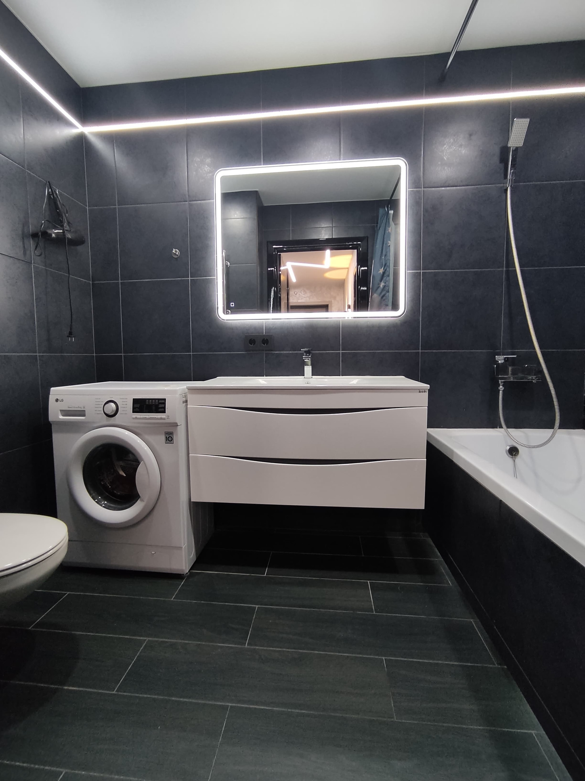 Ванна и туалет совмещены: подвесная тумба с раковиной, подвесной унитаз, стиральная машина.