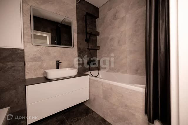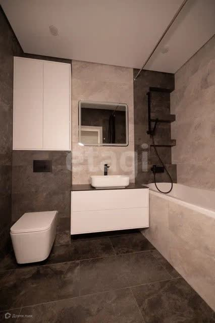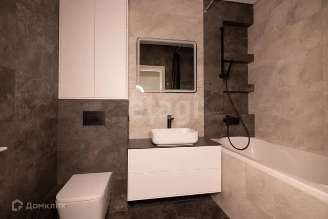 Сан - узел совмещенный в керамической плитке VENIS «Mirage Silver» и VENIS «Image Dark»; Установлен подвесной унитаз фирмы Azario; Акриловая ванна Riho Taurus; Зеркало с подсветкой.