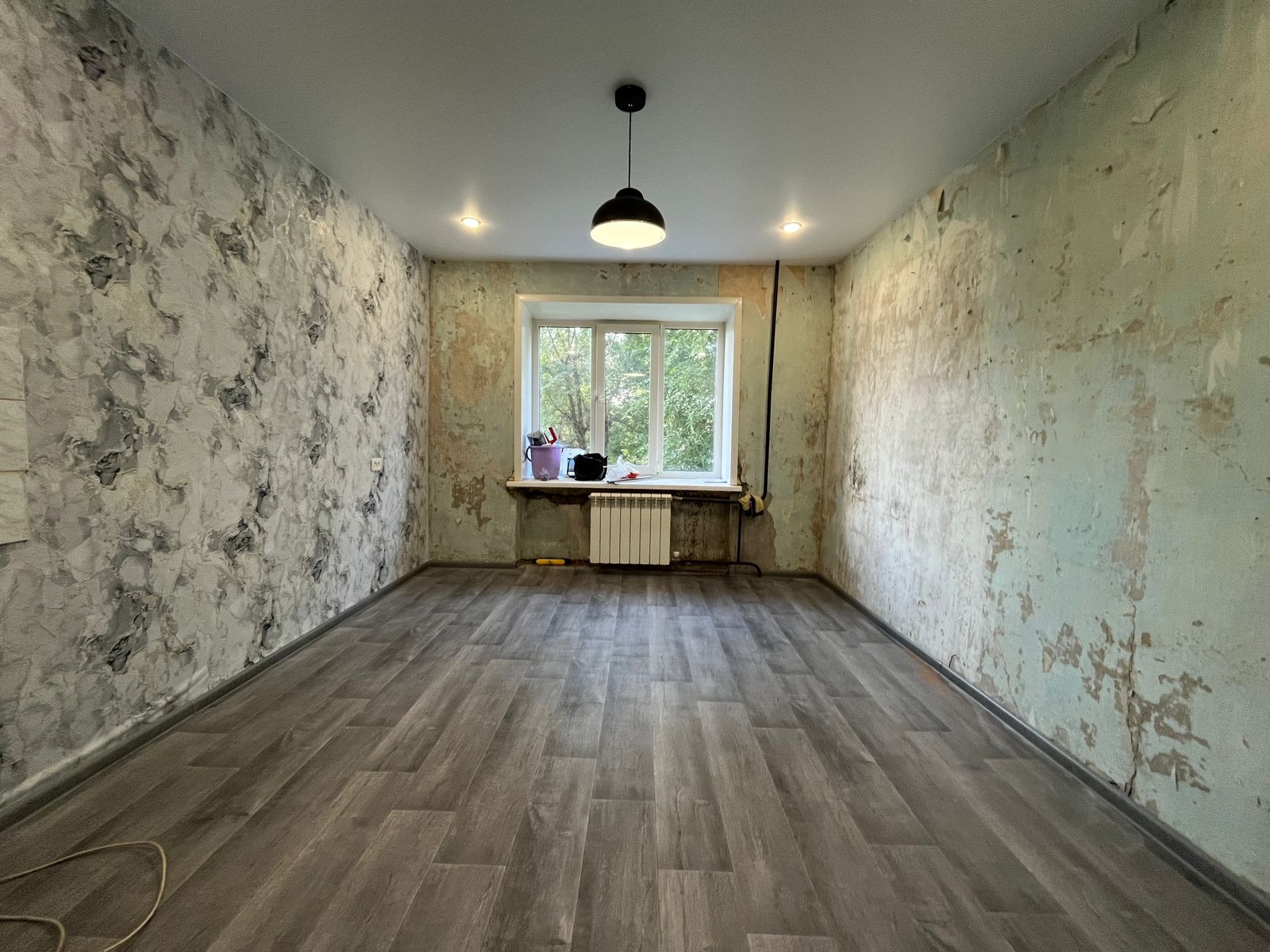 Сделан ремонт (натяжной потолок, покрытие пола, батарея, окно ПВХ).