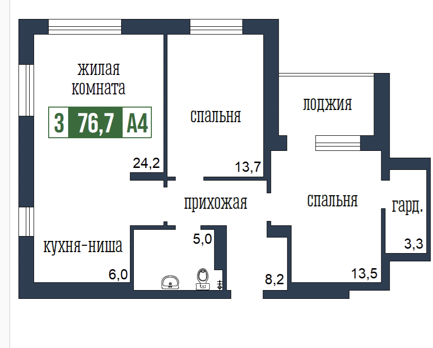 Общая площадь 76.7 м2