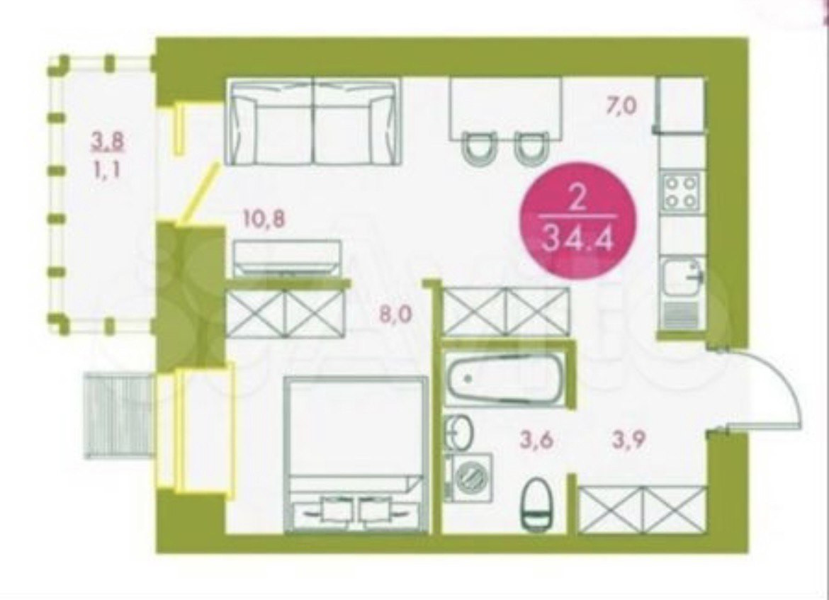 Общая площадь 34.4 м2