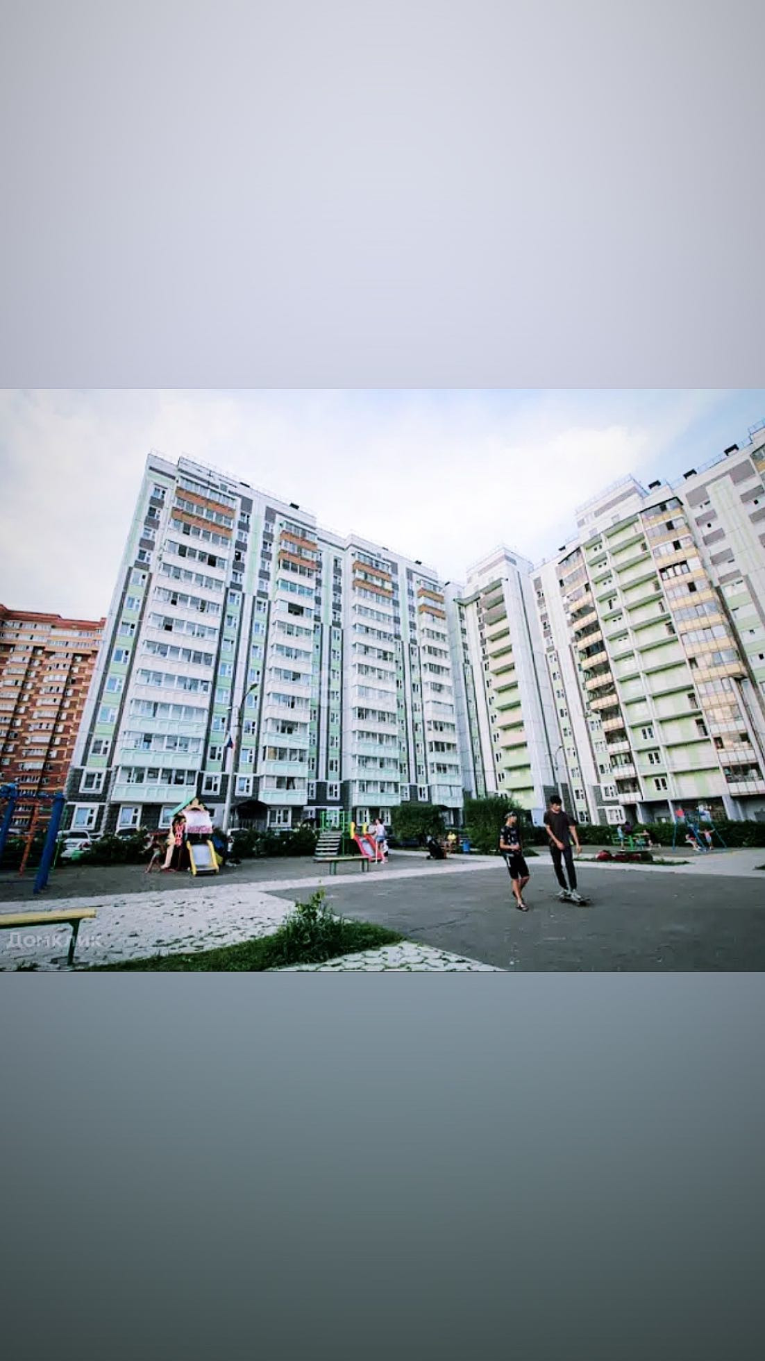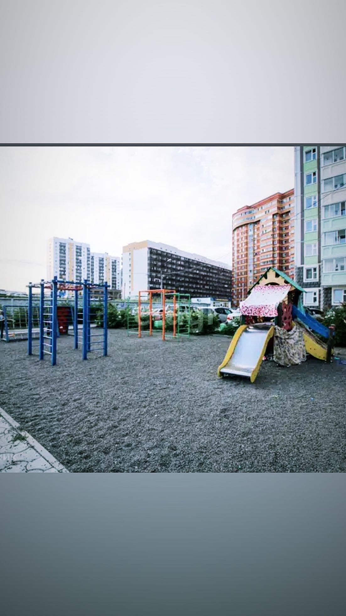 Придомовая территория: Большая детская площадка, во дворе стоят видеокамеры, пред домовая территория закрыта шлагбаумом.