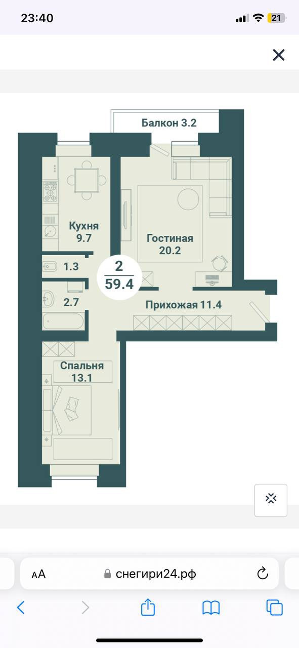 Общая площадь 59.4 м2