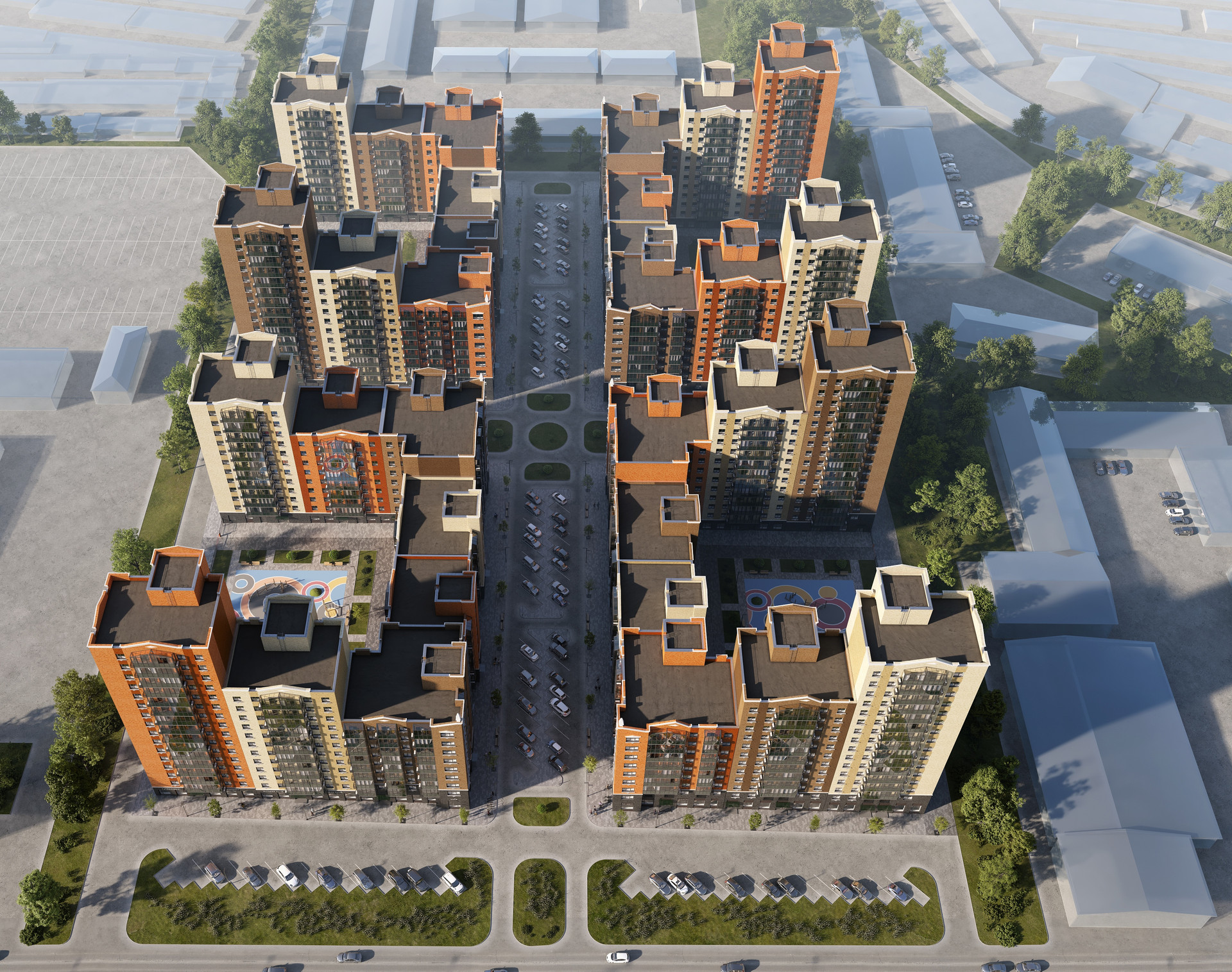Большой современный двор с резиновым покрытием.