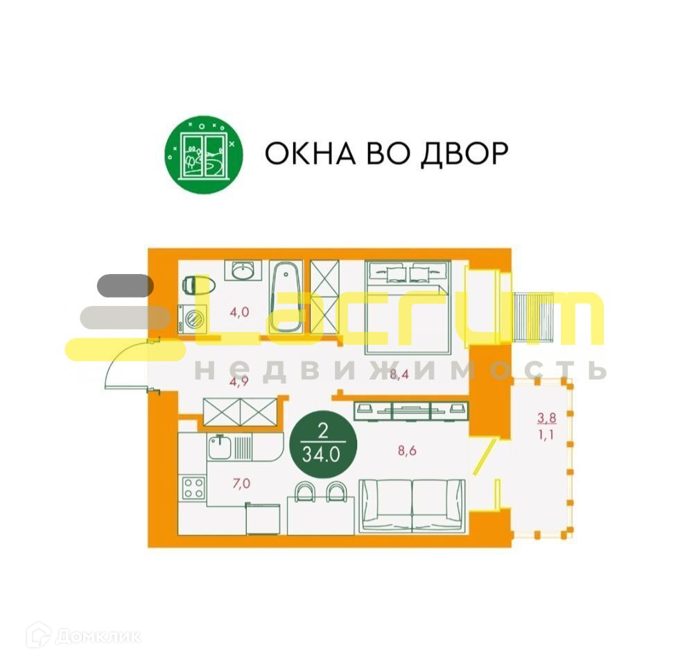 Общая площадь 34.3 м2