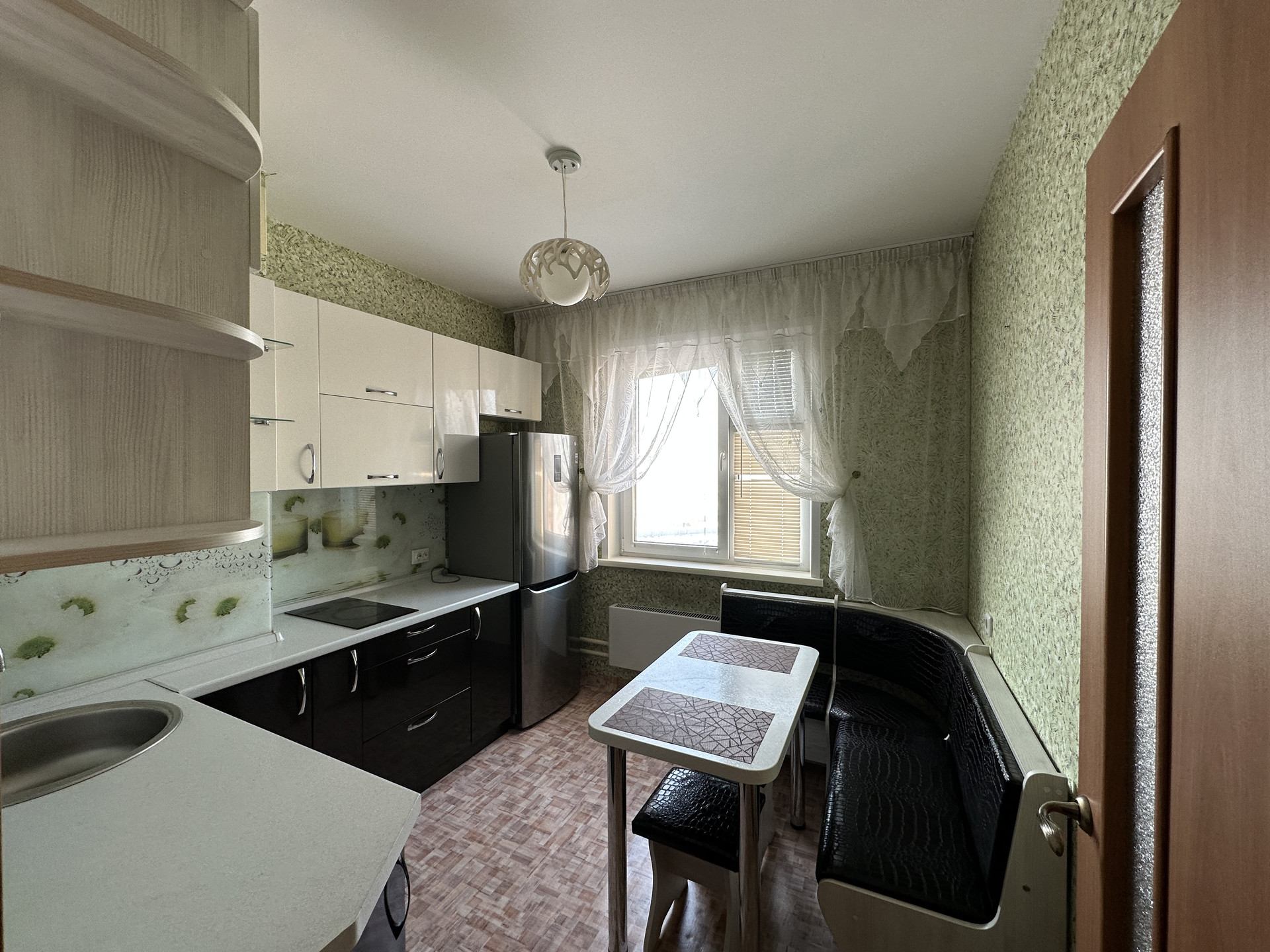 Кухня укомплектована кухонным гарнитуром со встроенной варочной панелью, большой холодильник, обеденная группа, стиральная машина.