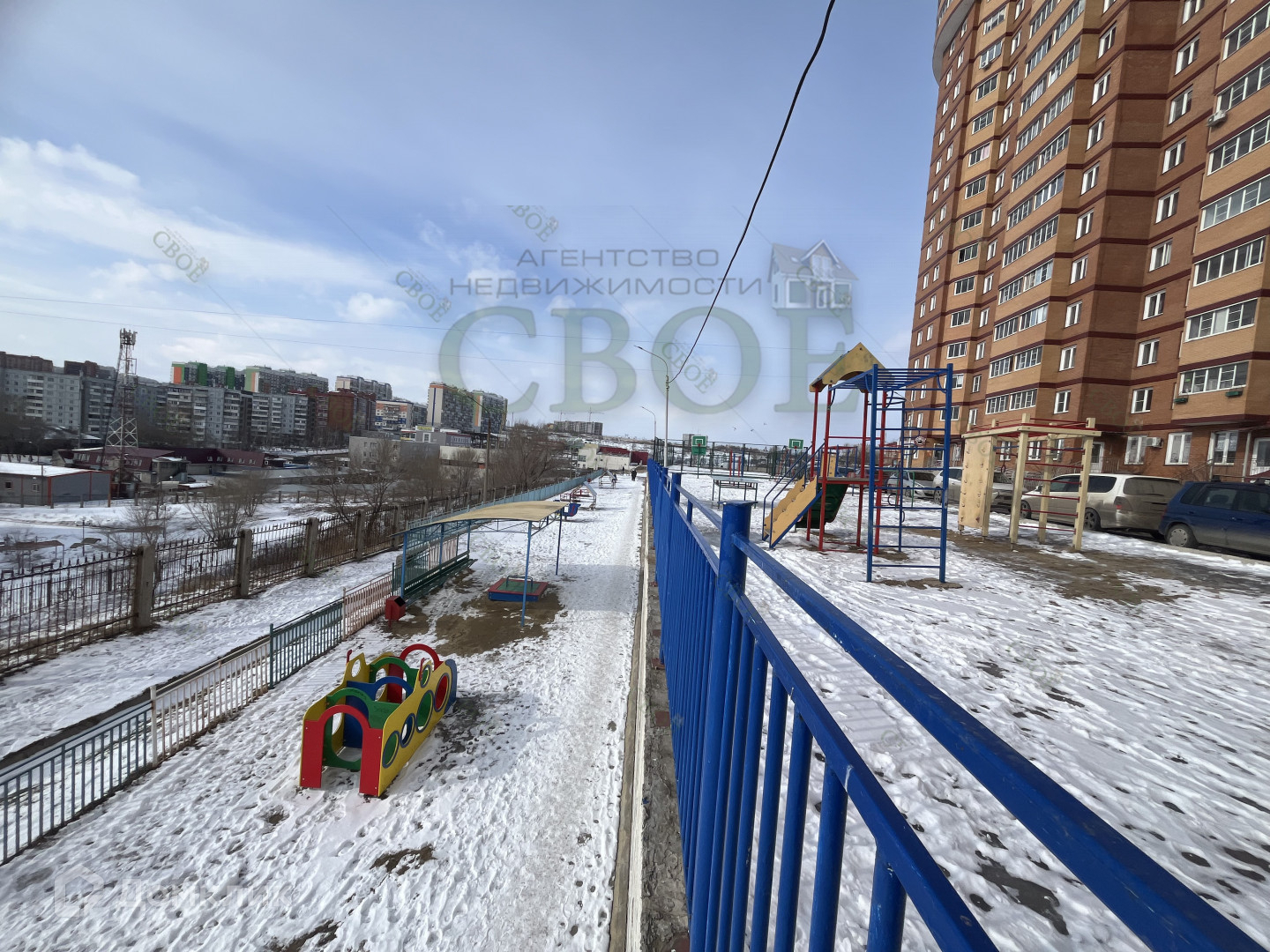 Во дворе большая, современная детская площадка.