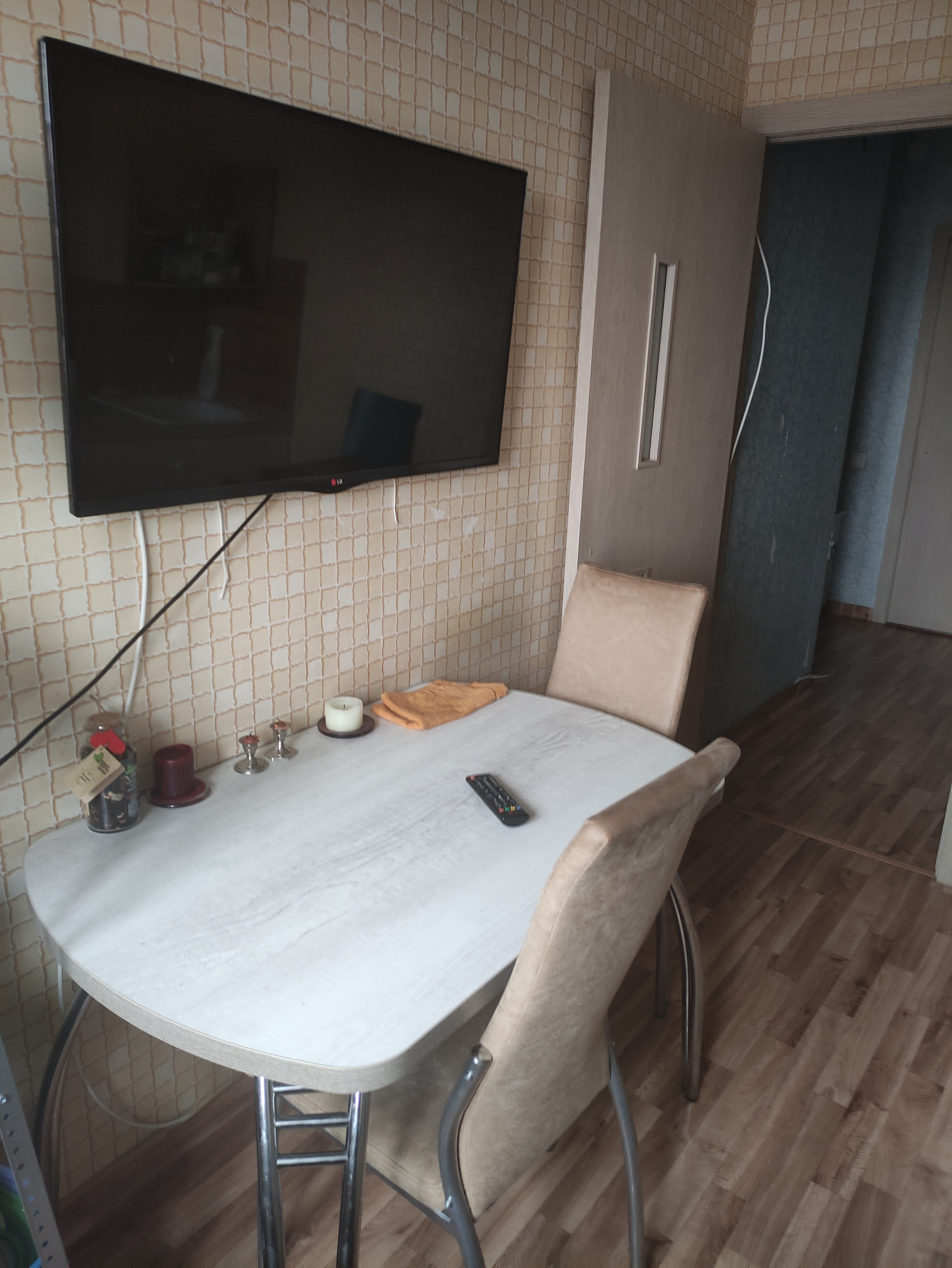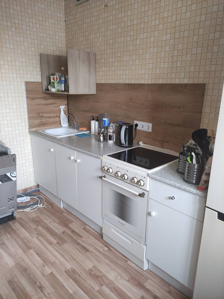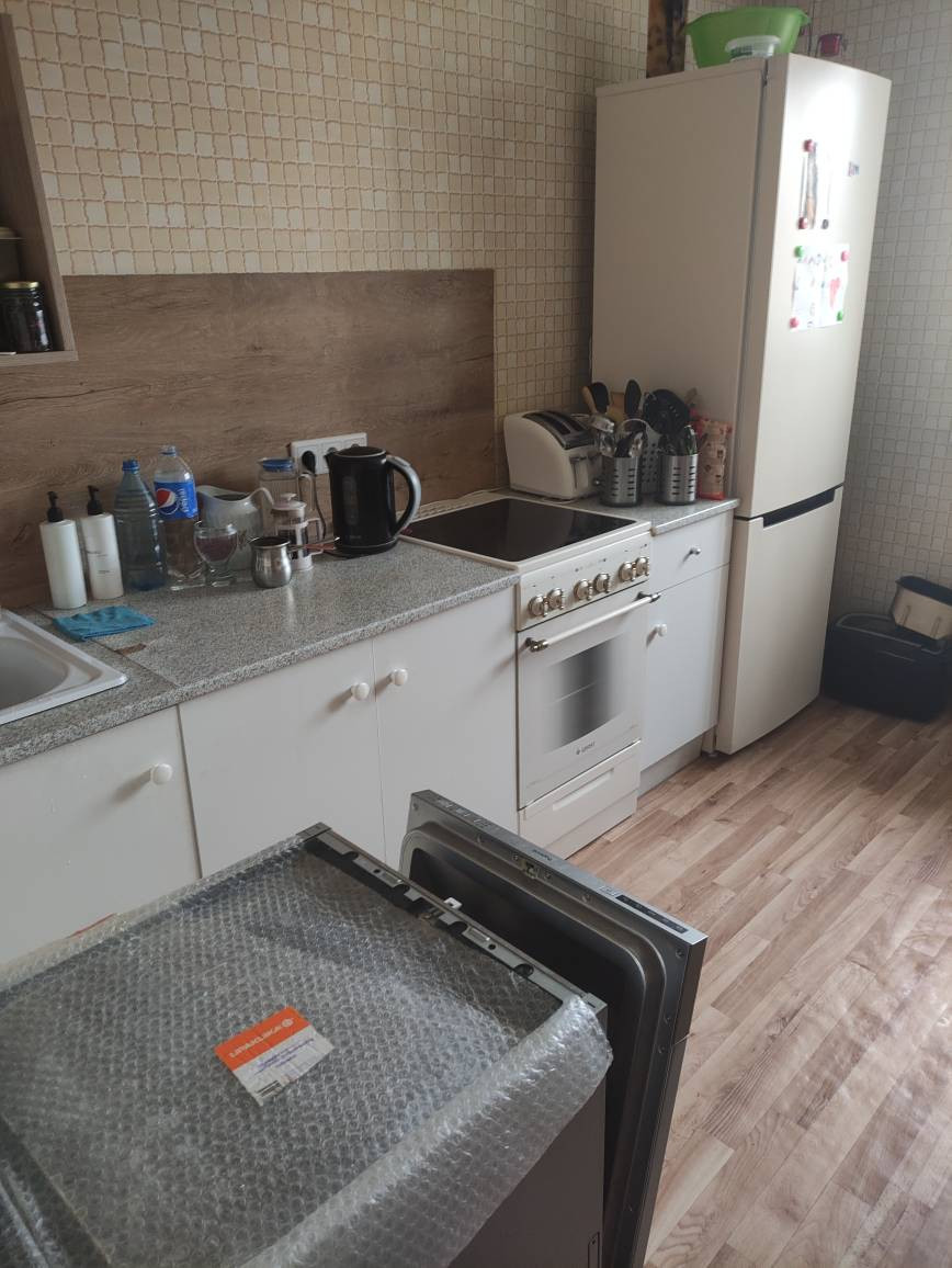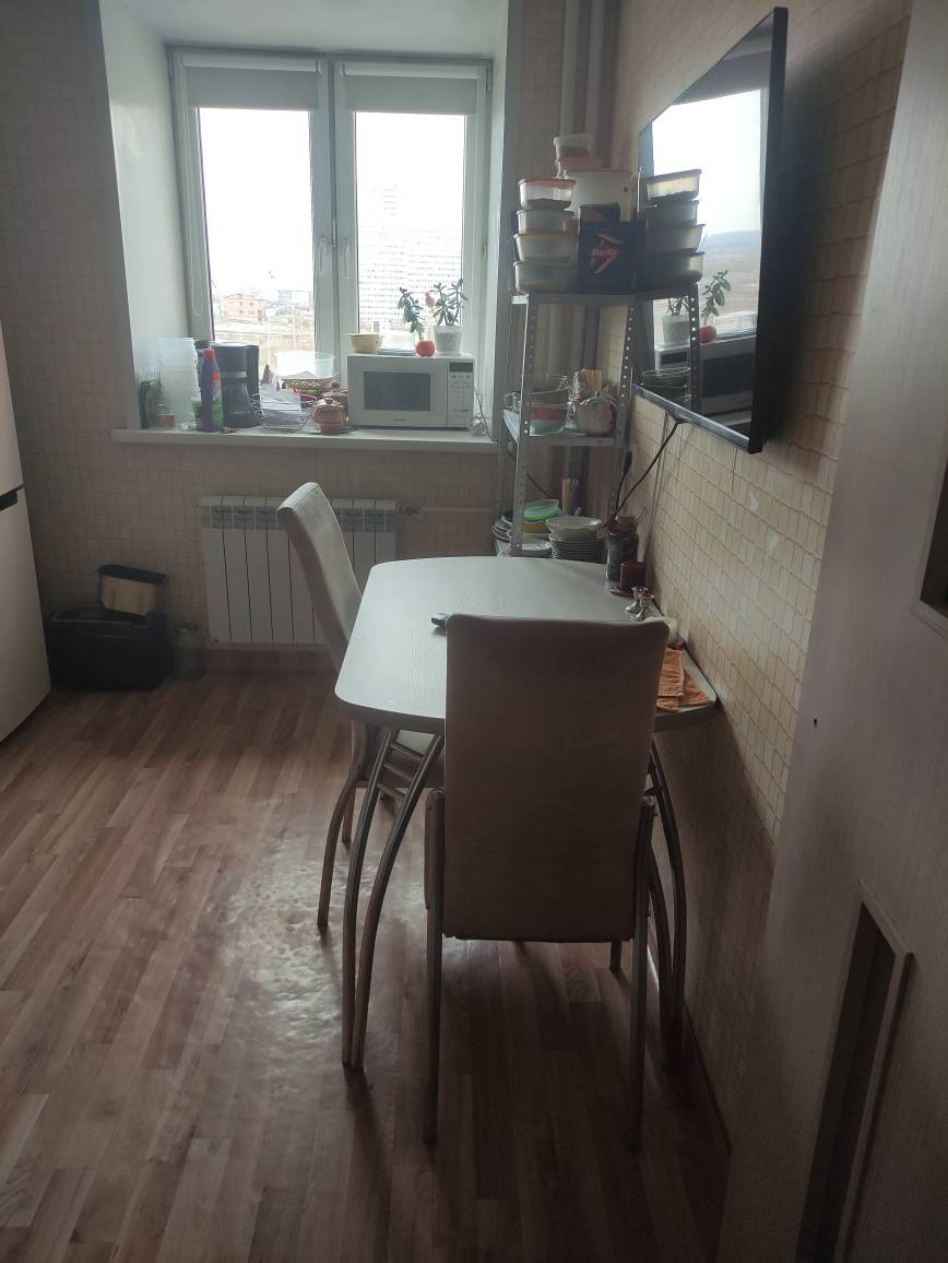 Квартира теплая, соседи нормальные,сделаны окна и лоджия (прорезинены - не дует). На окнах ролл-шторы блэк аут. Остается встроенный шкаф в комнате.