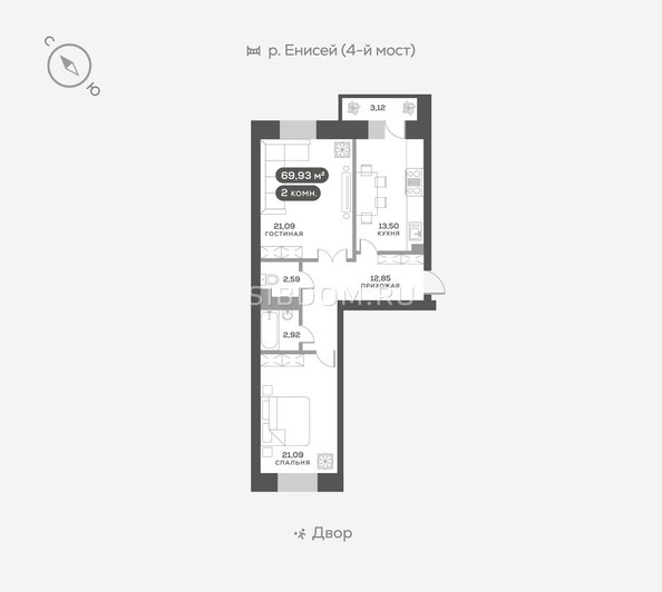 Общая площадь квартиры — 69.93 кв.м., жилая 35,25 кв.м., кухня 13,5 кв.м.