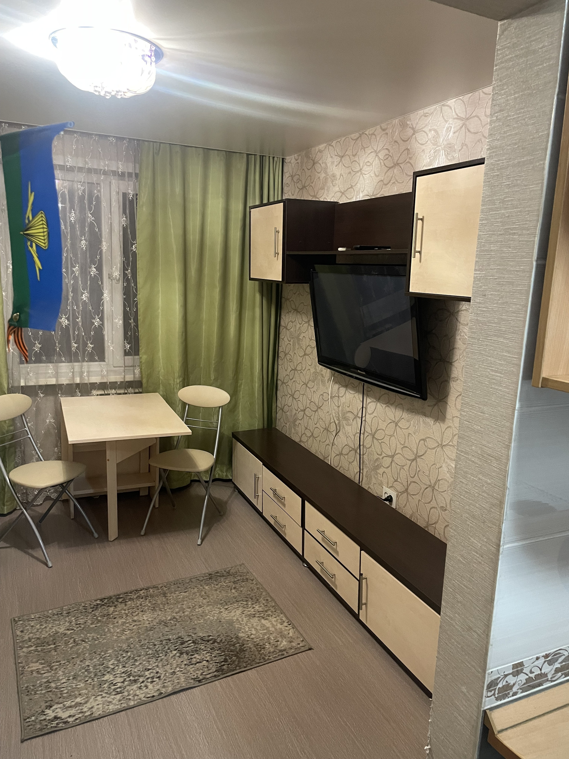 В зале ламинат. Потолки натяжные везде.