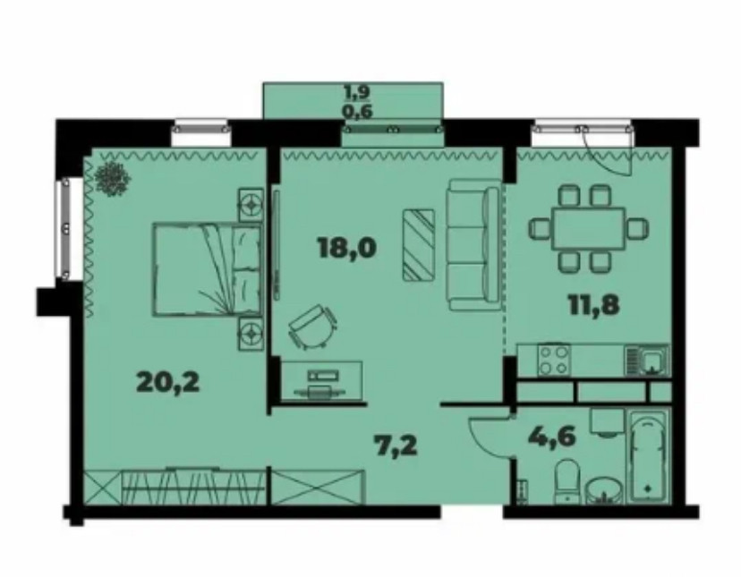 Общая площадь 62.2 м2