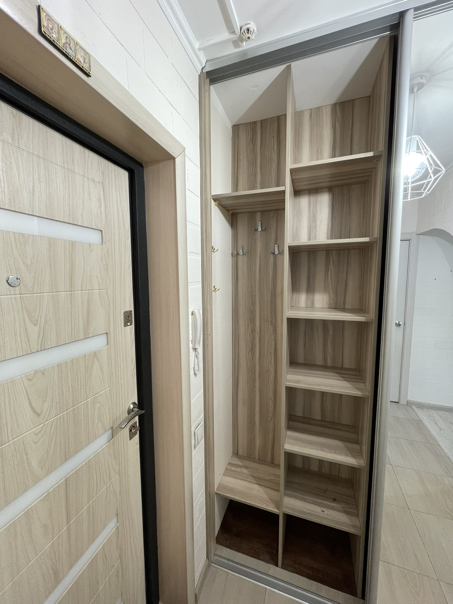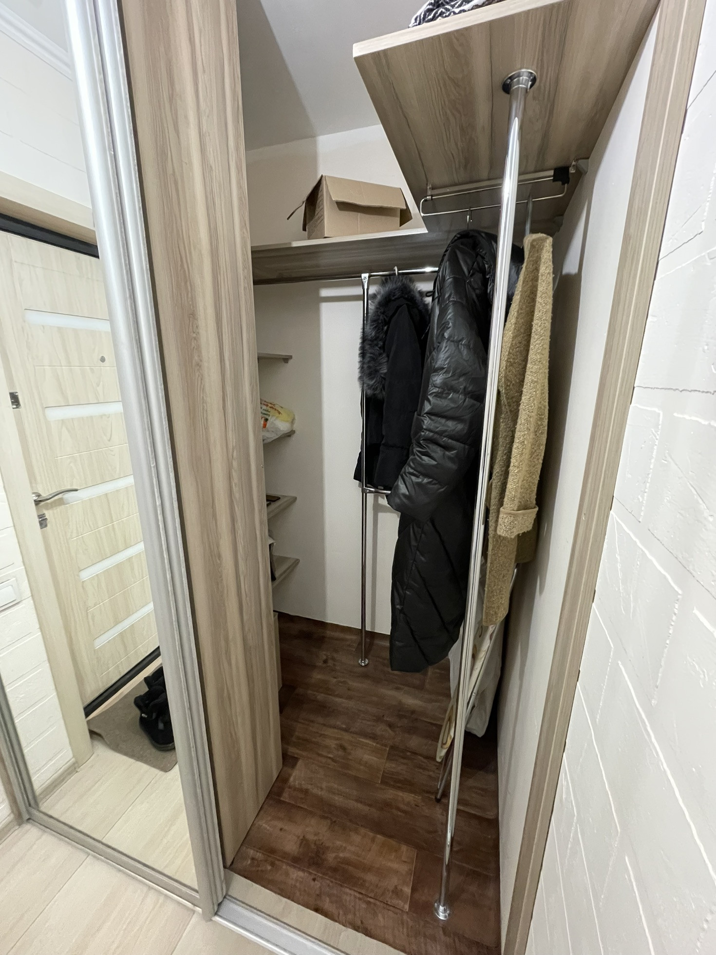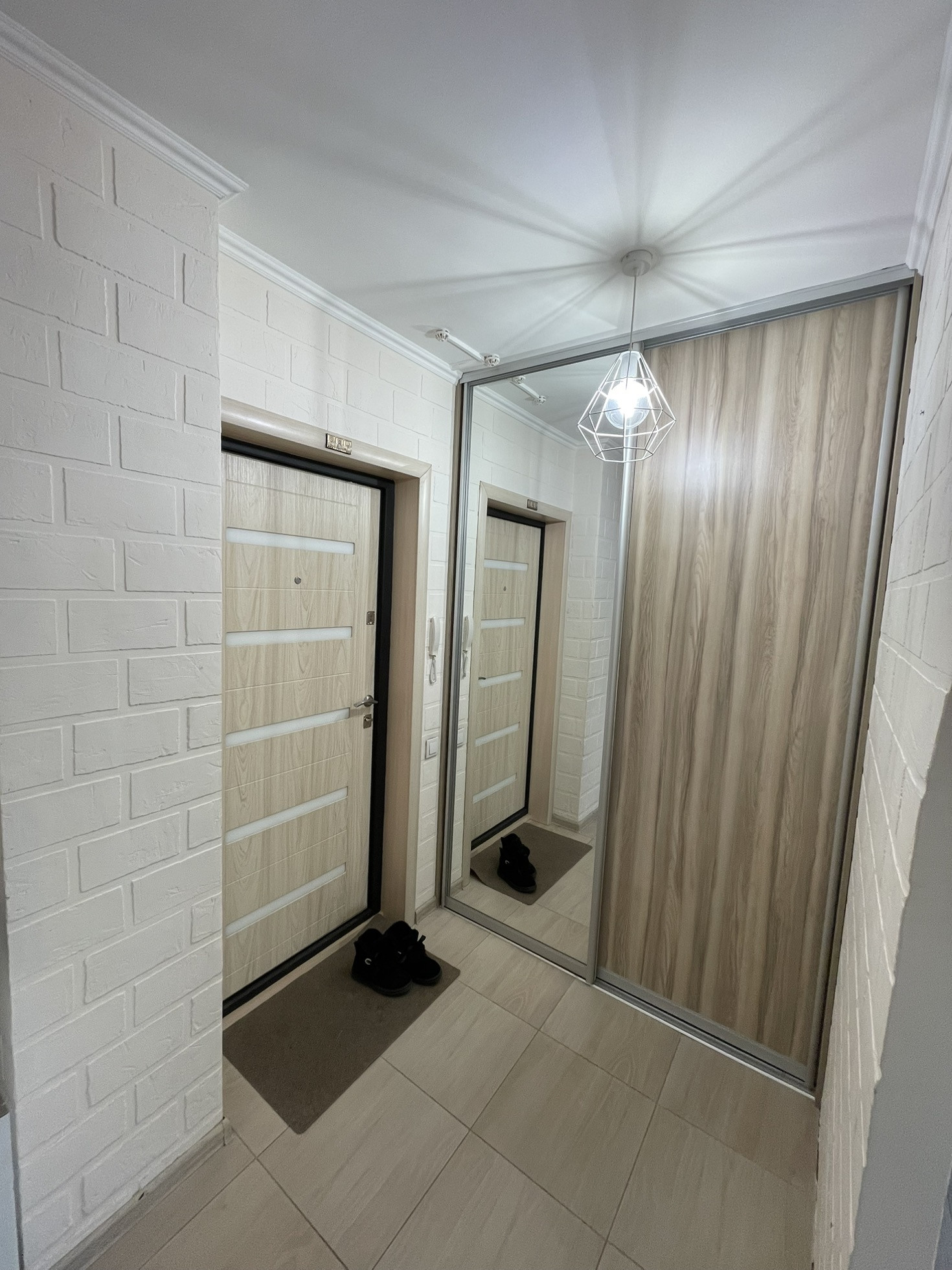 В коридоре кафель, имеется встроенный шкаф-гардеробная с большим зеркалом.