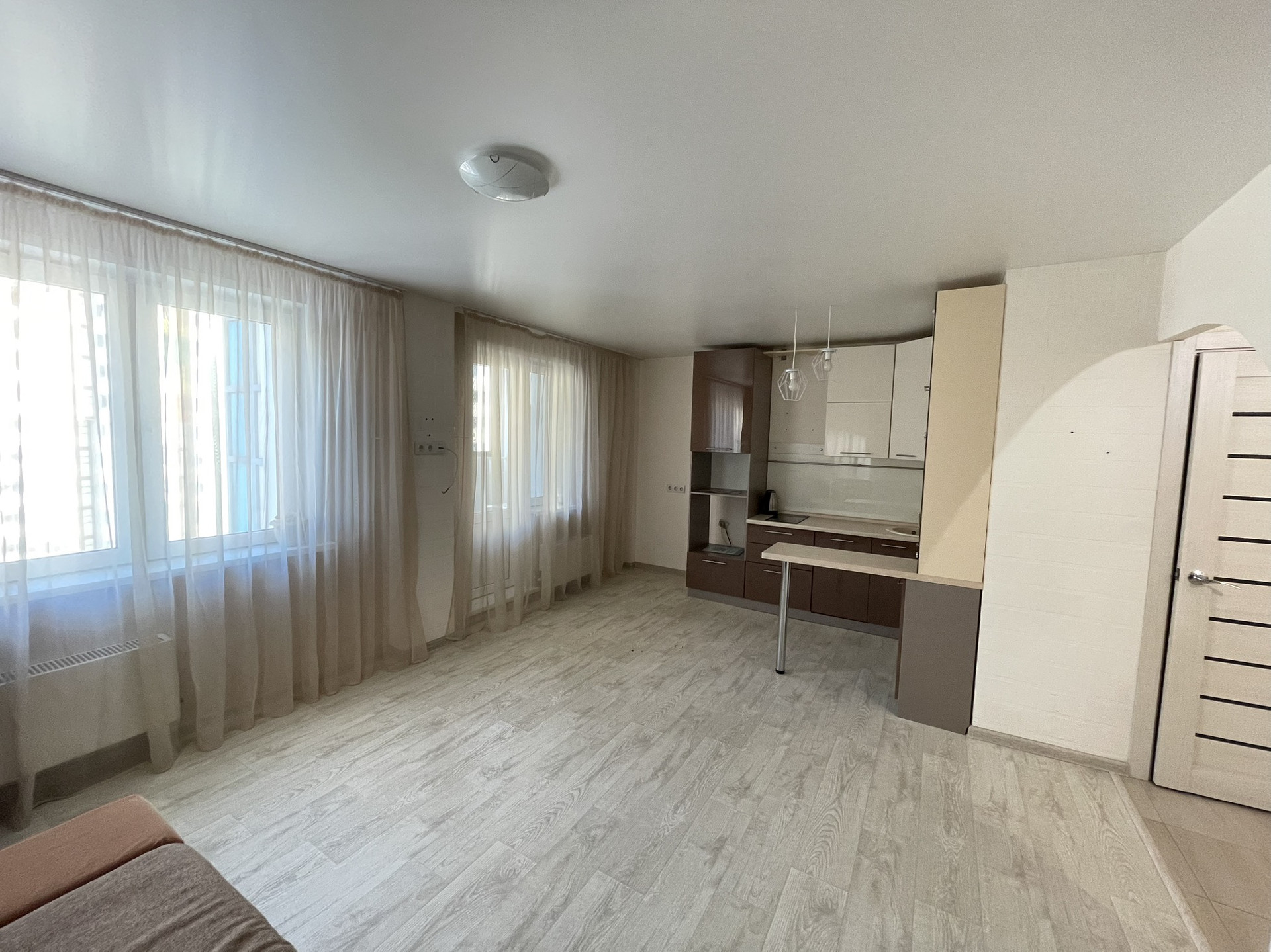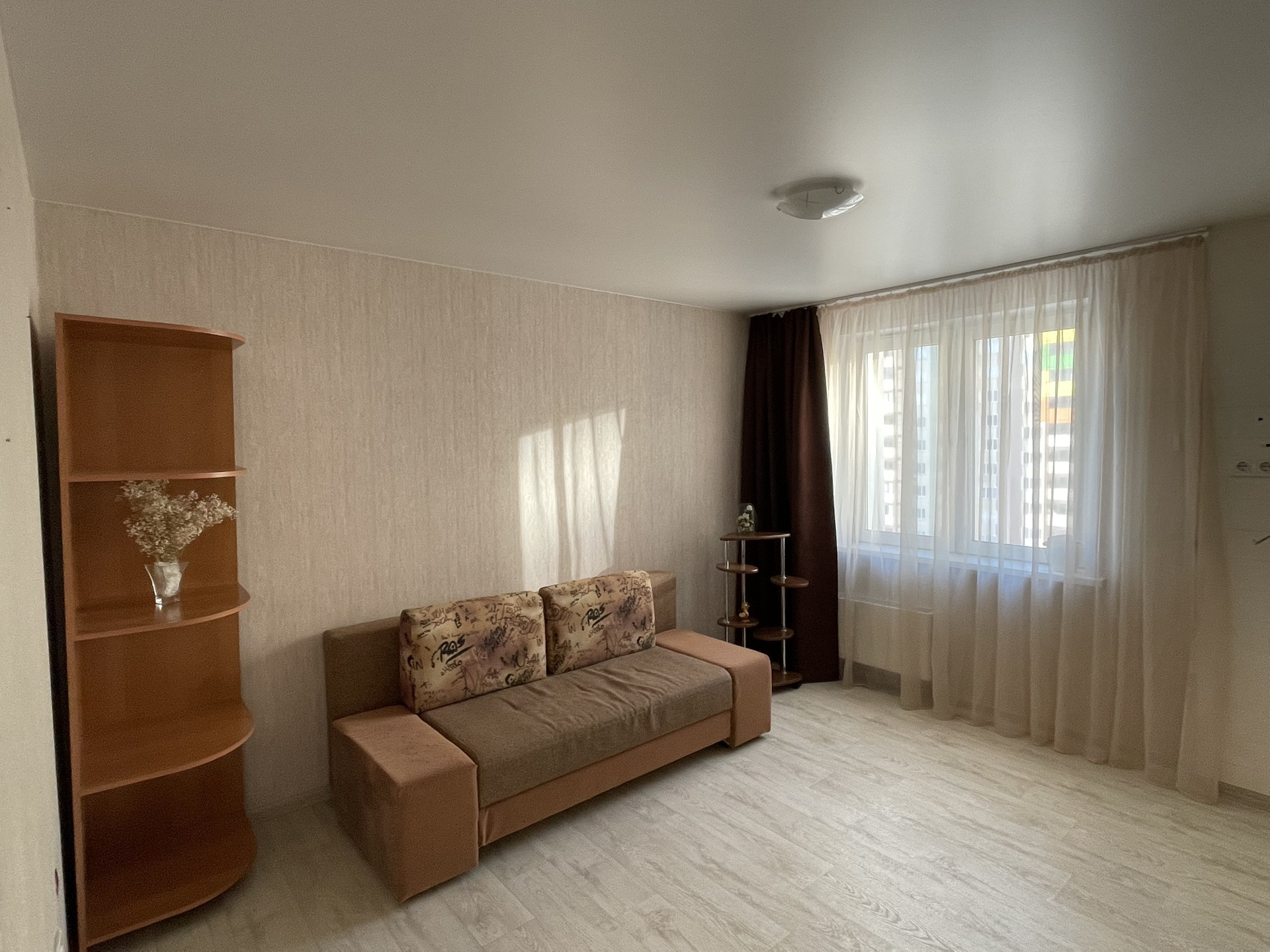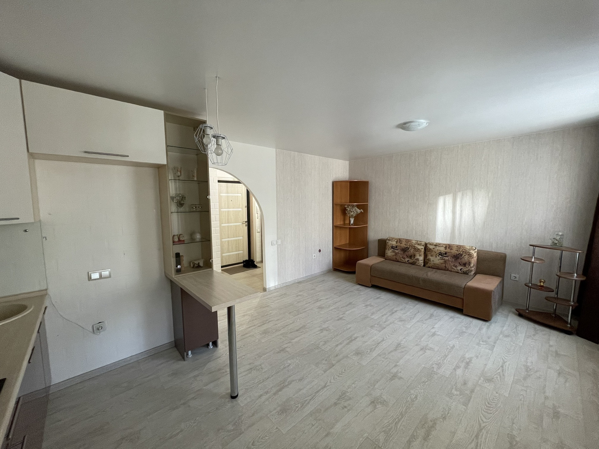Уютная студия на 11 этаже, удачное расположение дома открывает вид на п. Солонцы, а также хорошая освещенность, делает квартиру светлой и не жаркой.