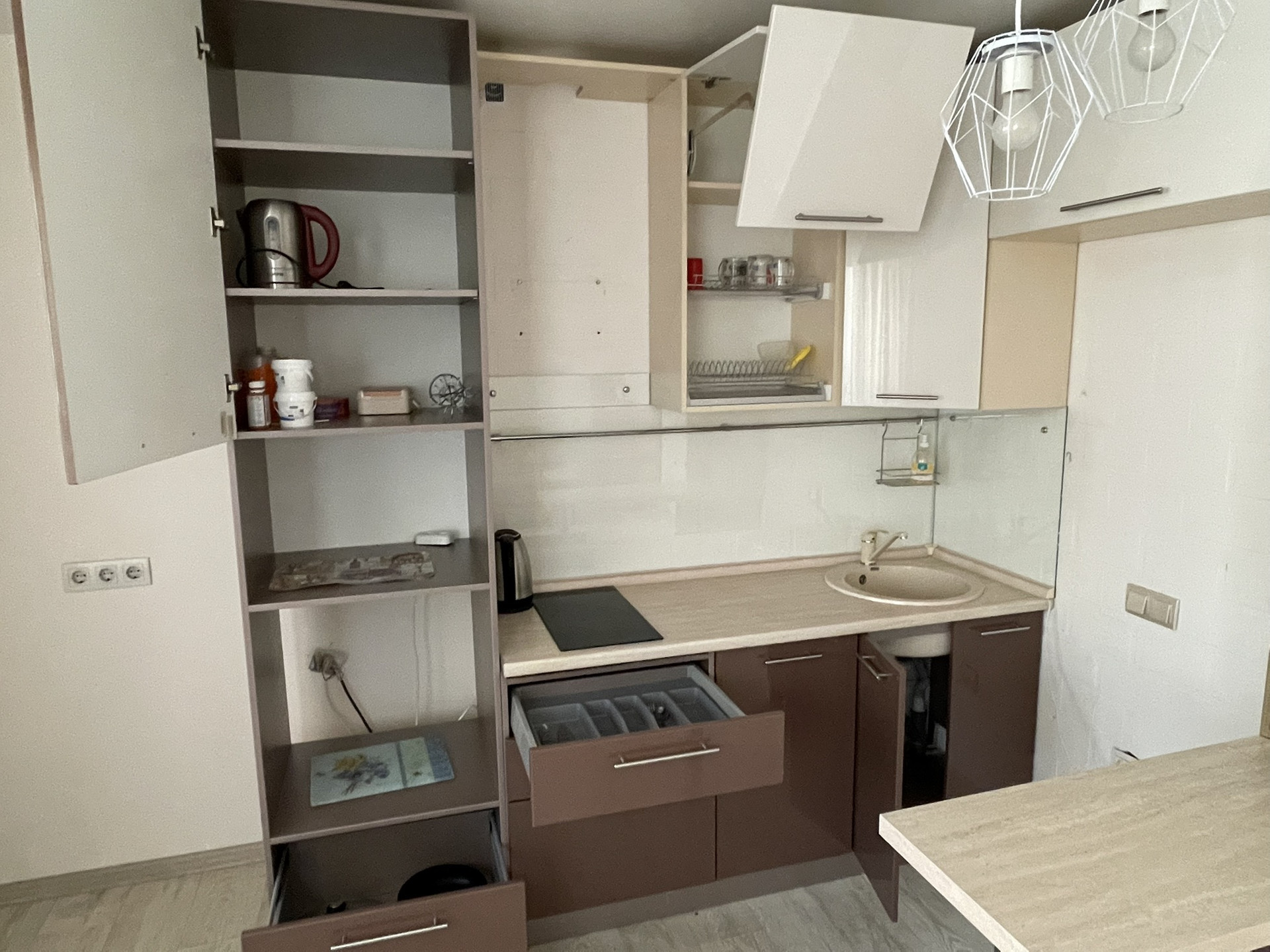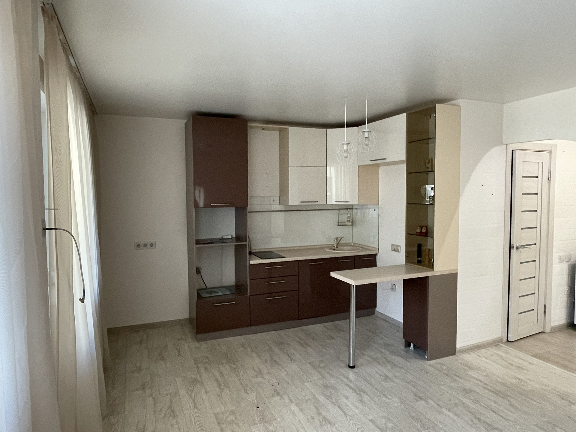 Квартира очень светлая, чистая. Остается встроенная кухня, предусмотренная для встроенной технике, барной стойкой, с варочной поверхностью.