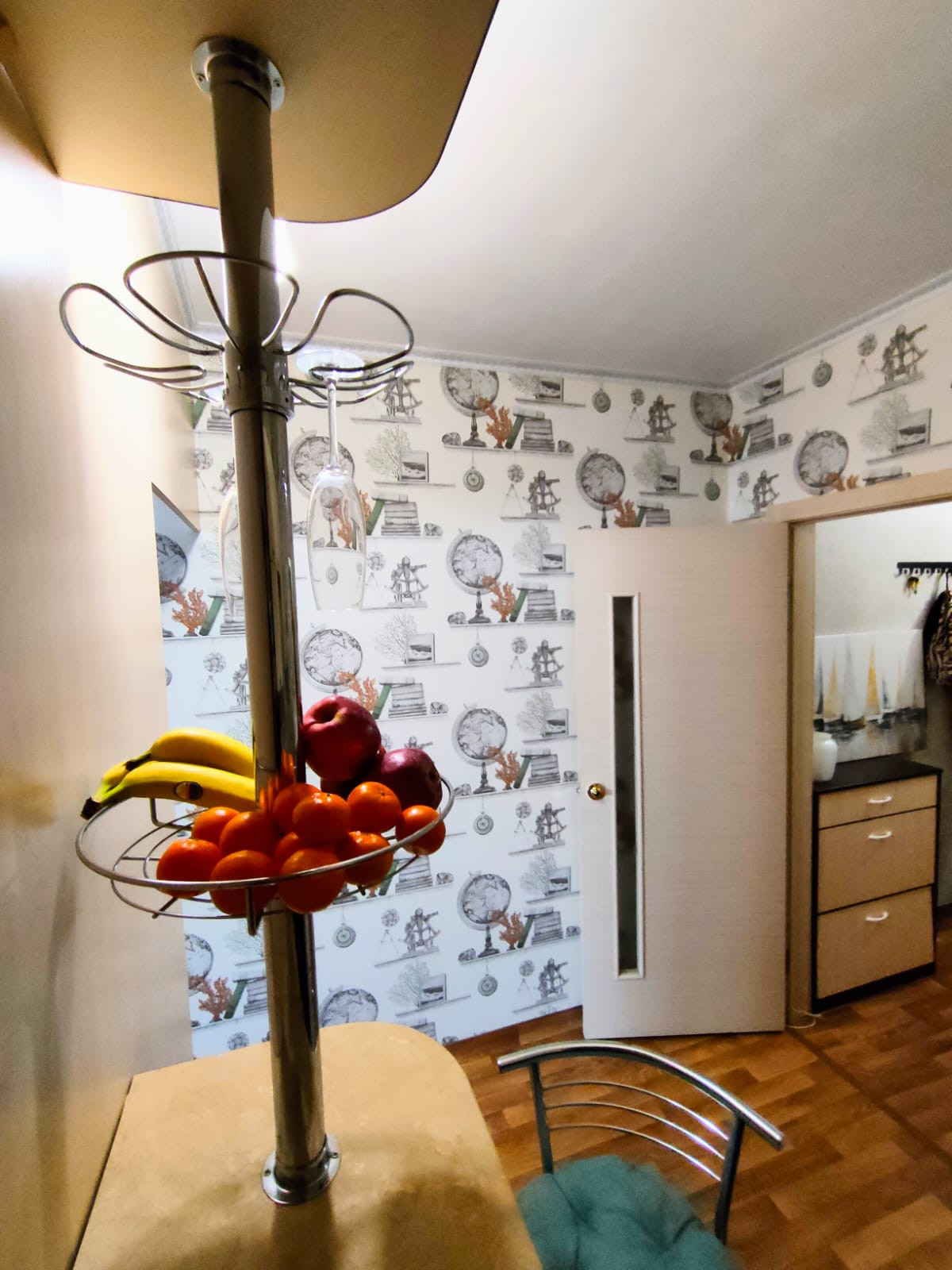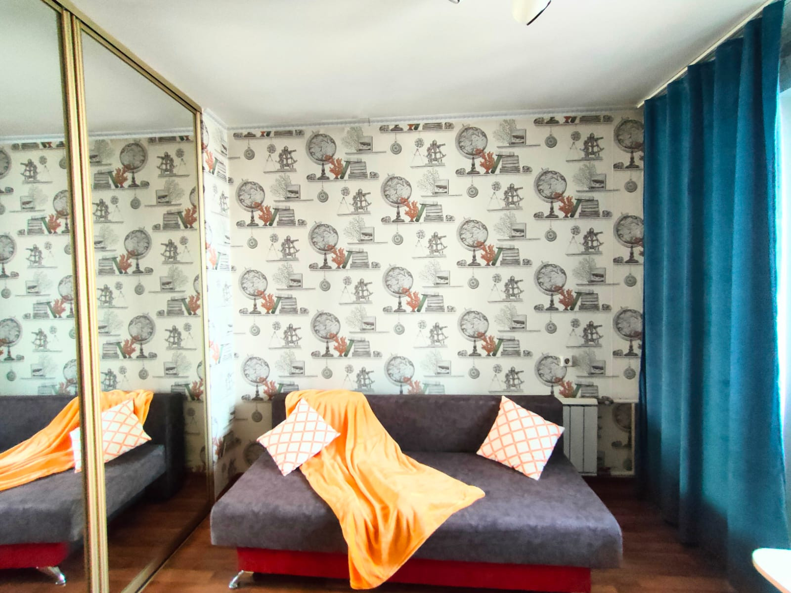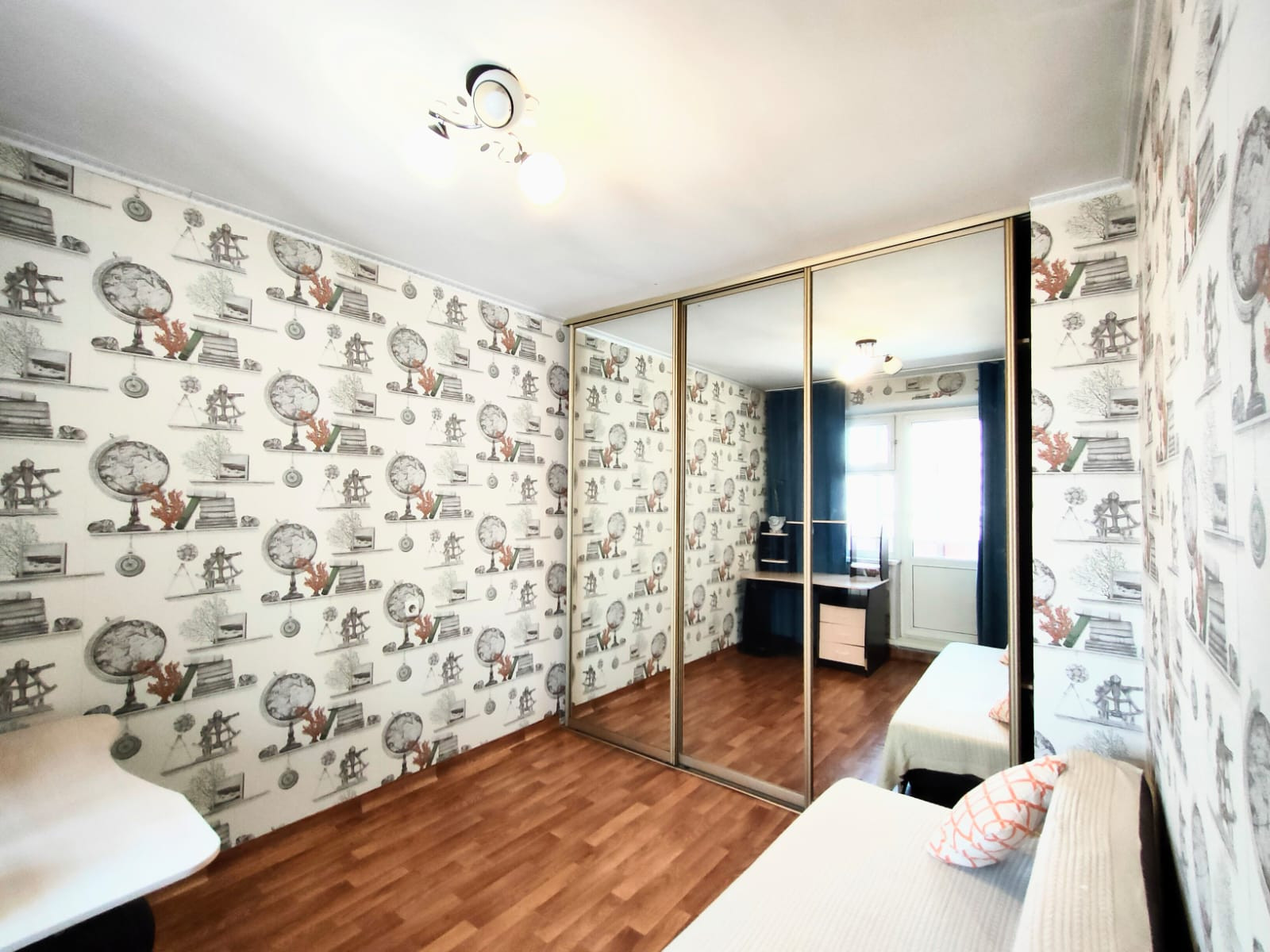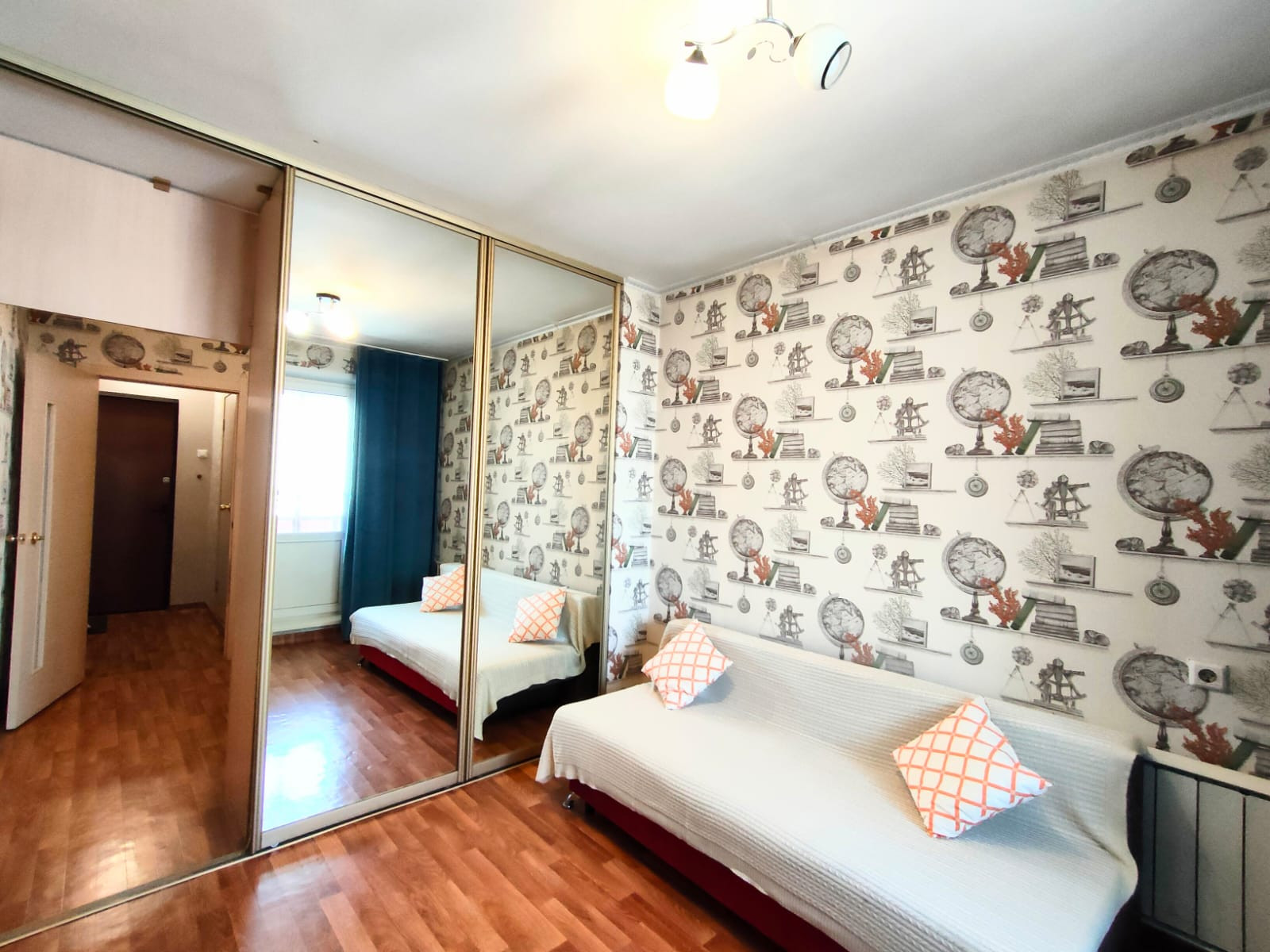 Шкаф с раздвижными зеркальными дверьми. Двери откатные на всю ширину комнаты. При желании можно полностью закрыть проход между комнатой и кухней. На стенах красивые качественные обои, потолок окрашен, на полу линолеум.