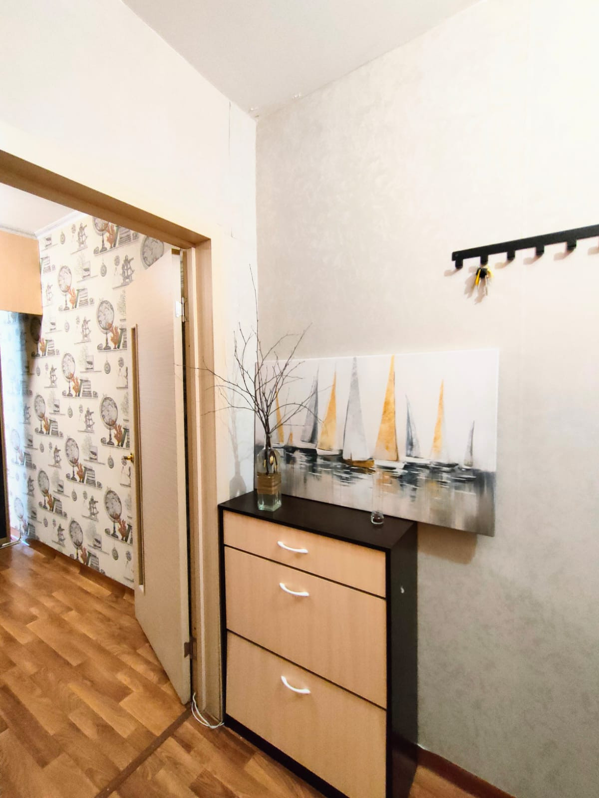 В прихожей на стенах новые светлые обои, на полу линолеум. Остается вместительная обувница с полкой под головные уборы. На стене вешалка.