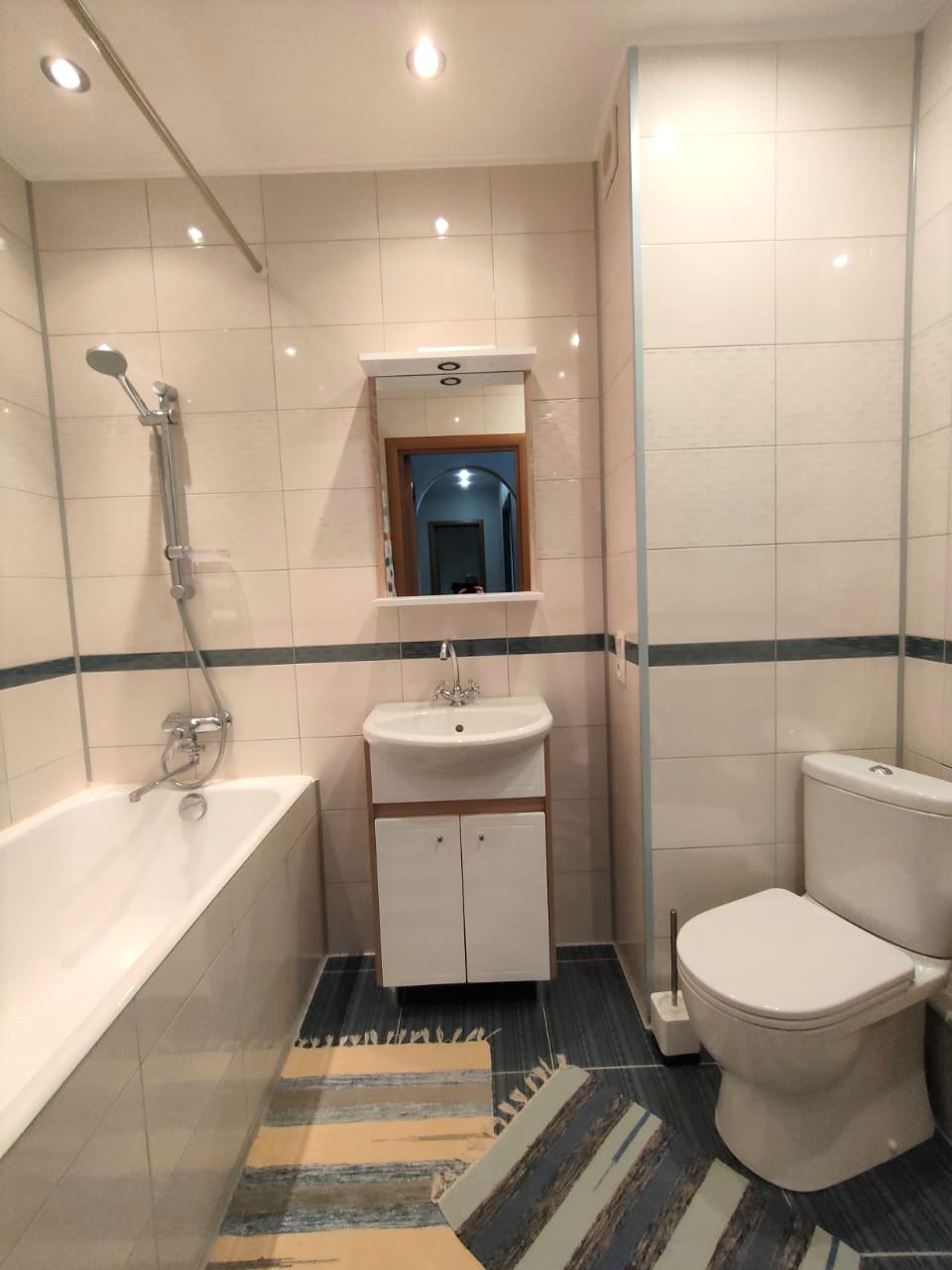 - санузел совмещенный в современном кафеле до потолка,