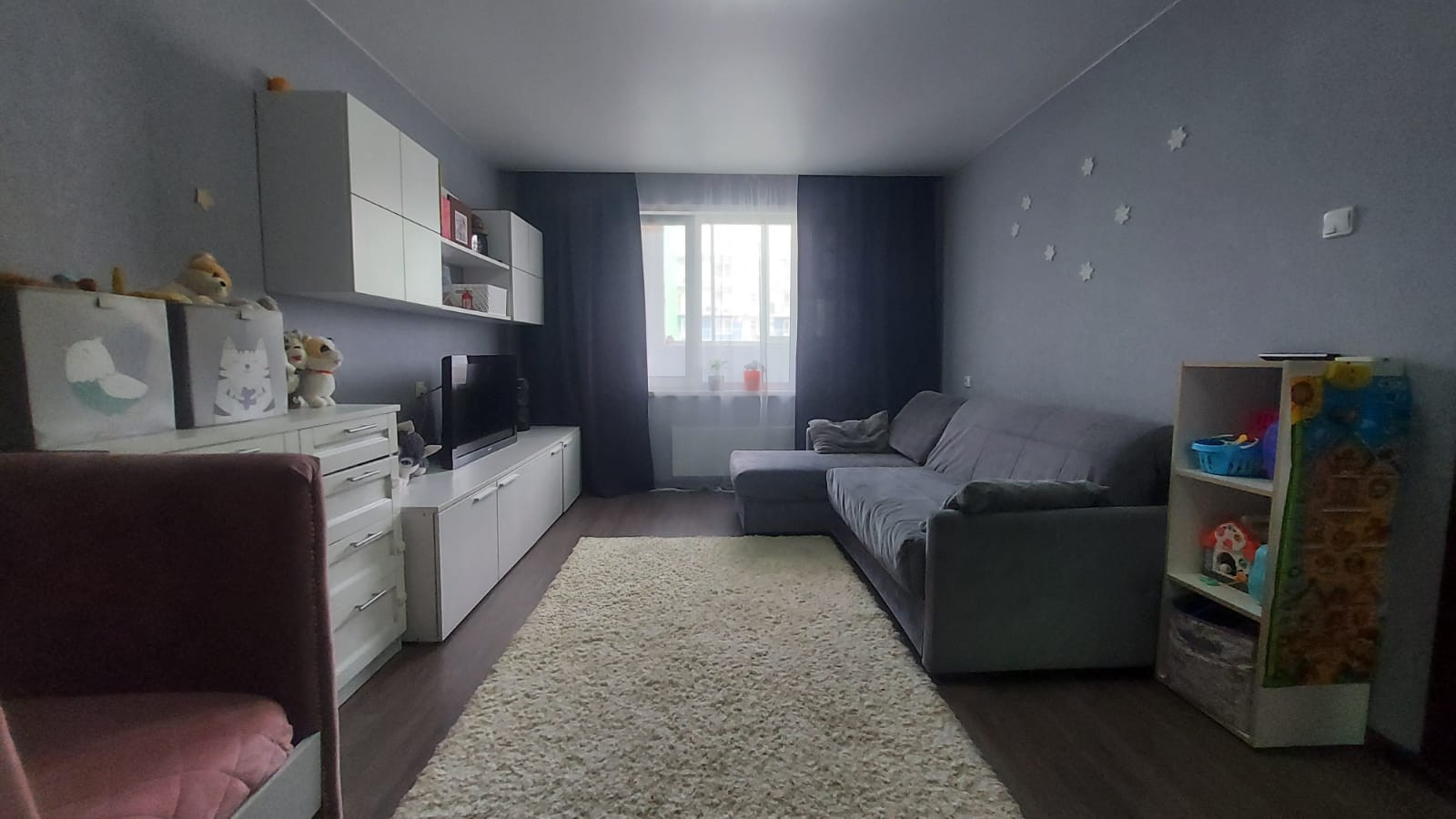 Квартира полностью меблирована, включая комфортабельный диван и вместительный шкаф. Из окна открывается живописный вид на город, который будет радовать вас каждый день.