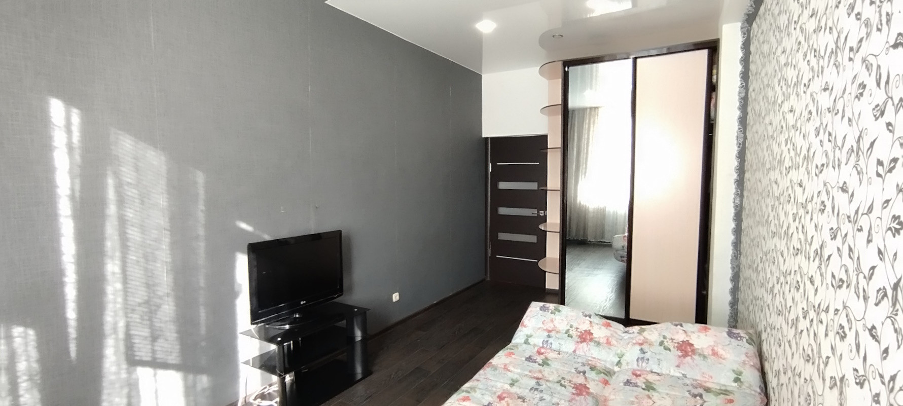 Планировка квартиры изначально шла как «евро», в которой кухня-гостиная почти 25м2. Большая площадь и высокие потолки 3м позволили разделить огромную площадь на отдельную комнату с окном и просторную кухню с барной стойкой. Как итог – у вас две большие отдельные спальни и кухня-гостиная внушительных размеров.  Кухонный гарнитур остается. Как и все встроенные шкафы. В комнатах натяжные потолки, на полу линолеум, пластиковые окна, обои на стенах. В кухонной зоне, коридор и санузел – на полу кафель.