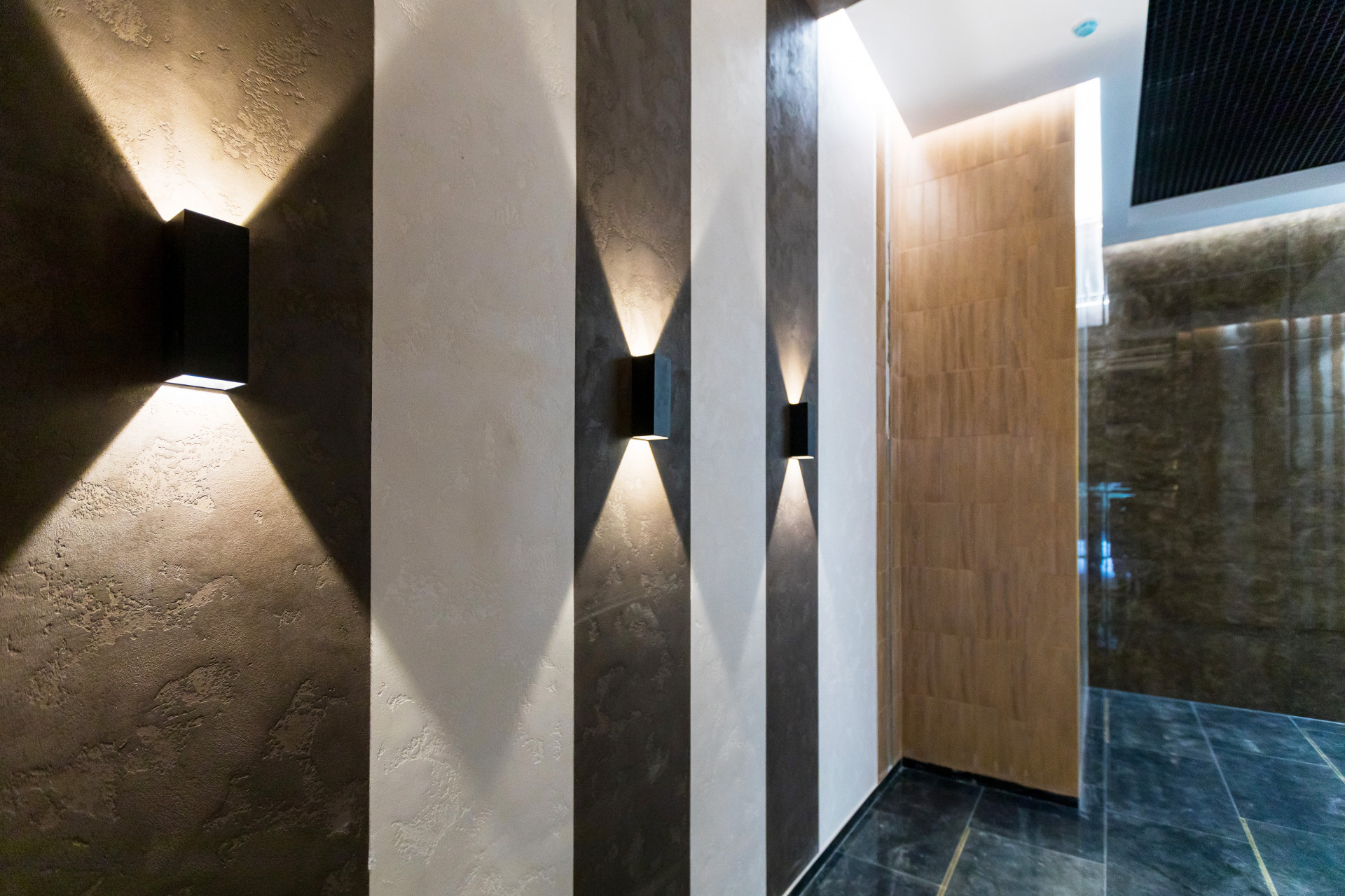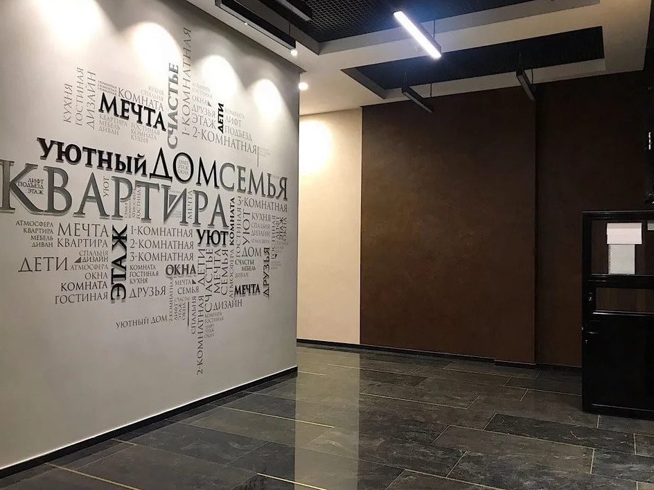 Вместо стандартного подъезда в ЖК "Уютный Дом на Дудинской" создан дизайнерский лифтовой холл с зеркалами, художественной подсветкой и декоративной инсталляцией на стене в виде облака ассоциаций на тему "Уютный Дом".