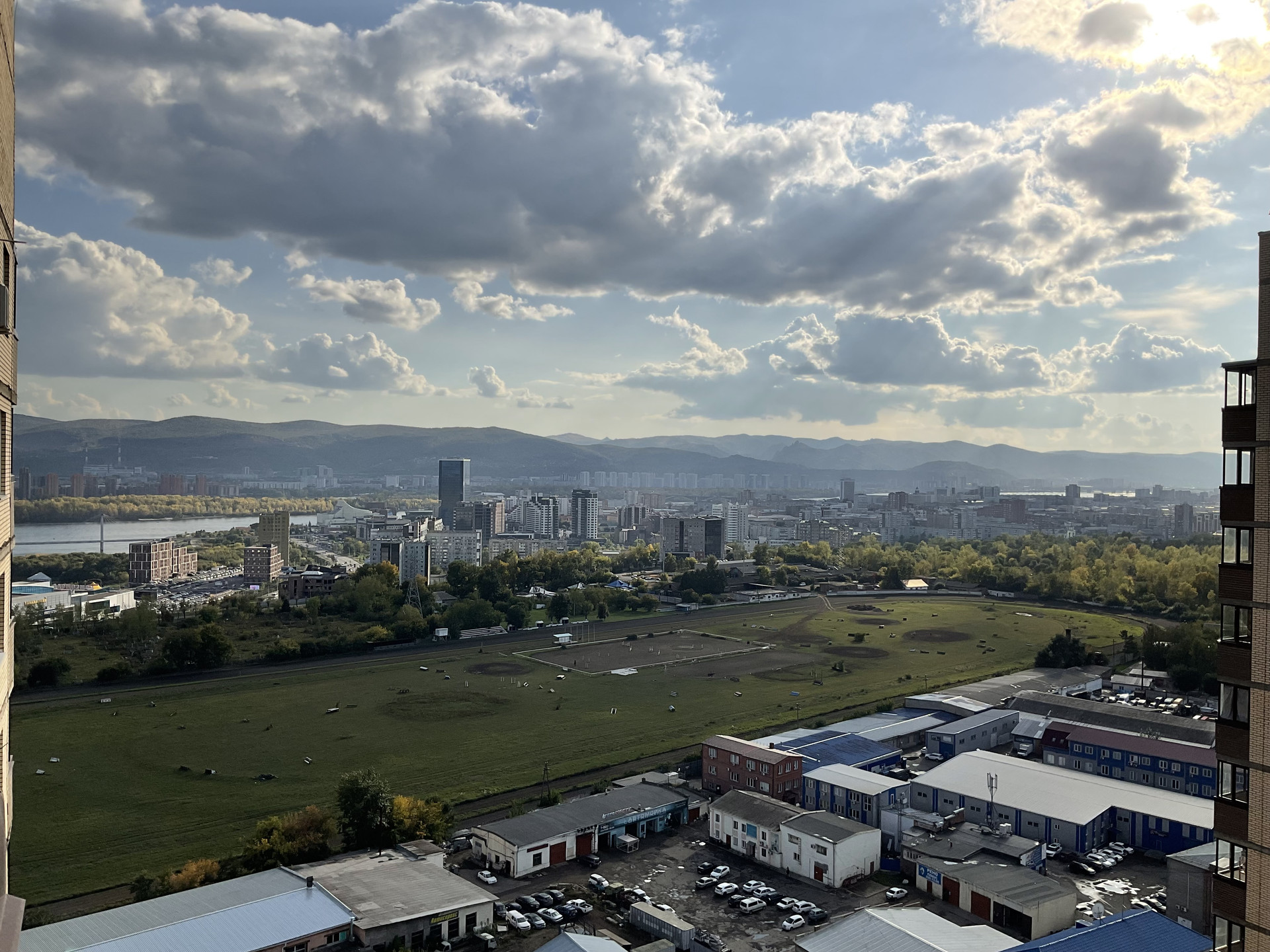 Из окна квартиры открывается частично вид на Енисей, Вантовый мост, ипподром.