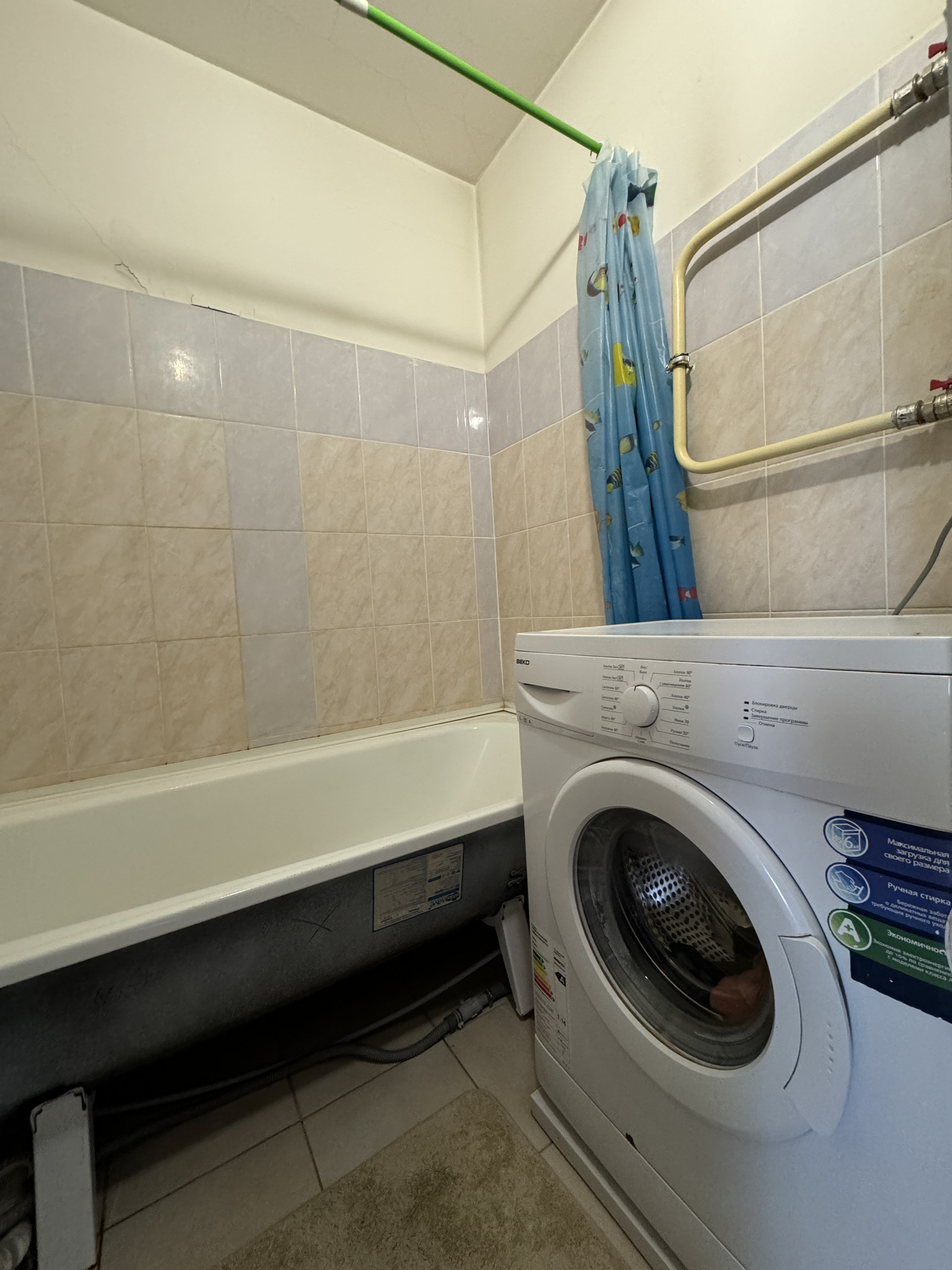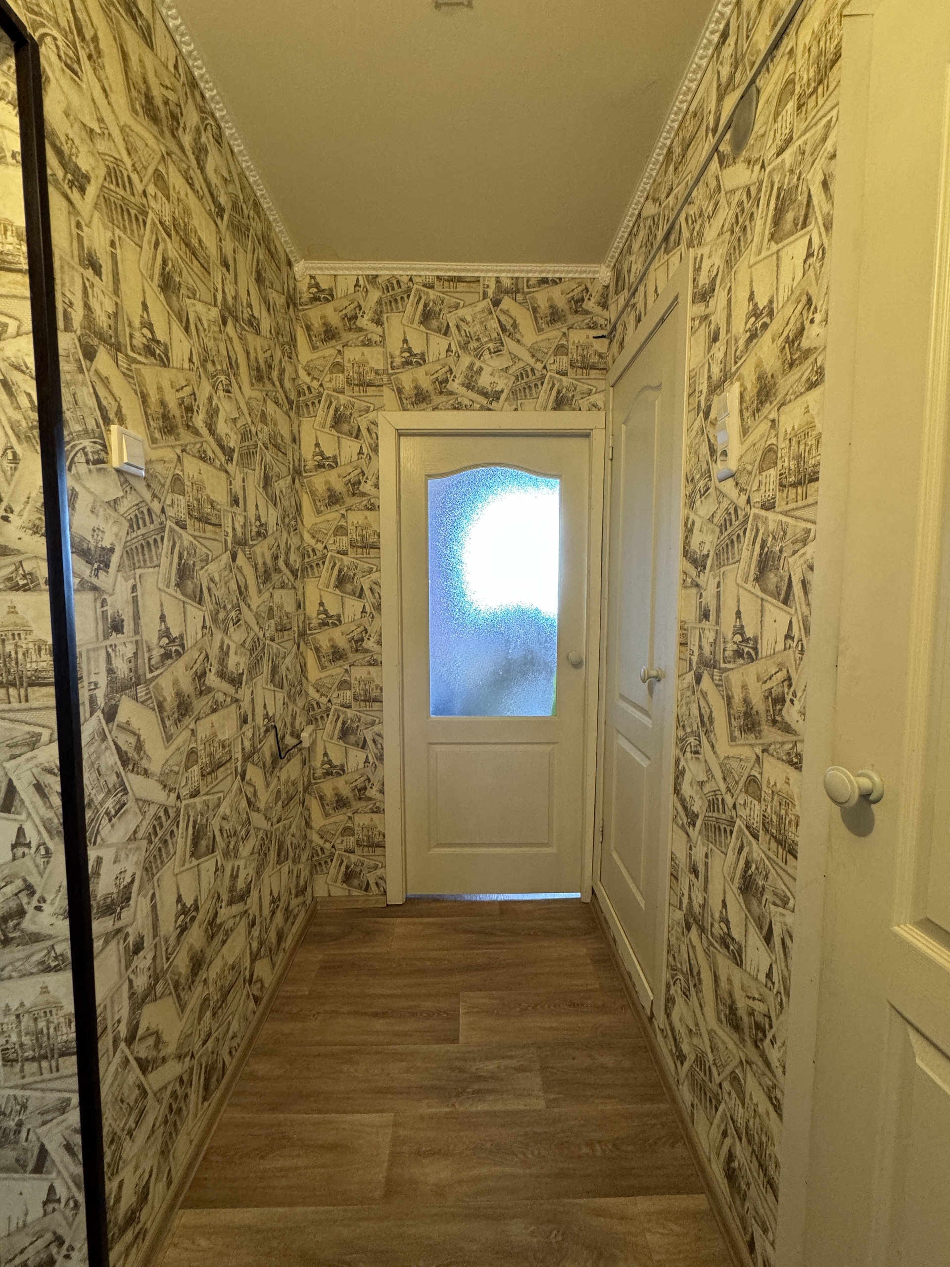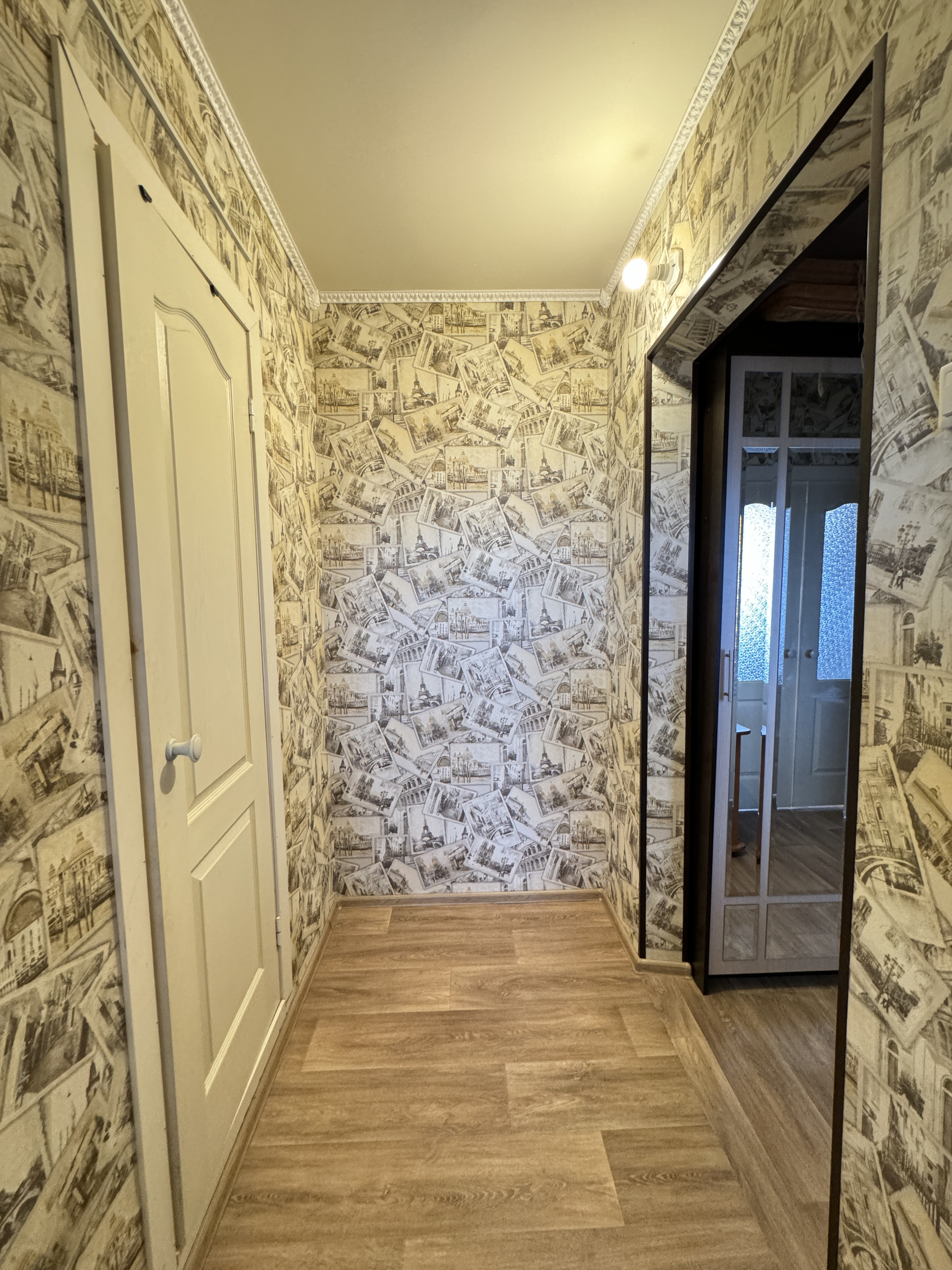 В комнате на полу линолеум, на стенах обои, ровные белые потолки, санузел в кафельной плитке.